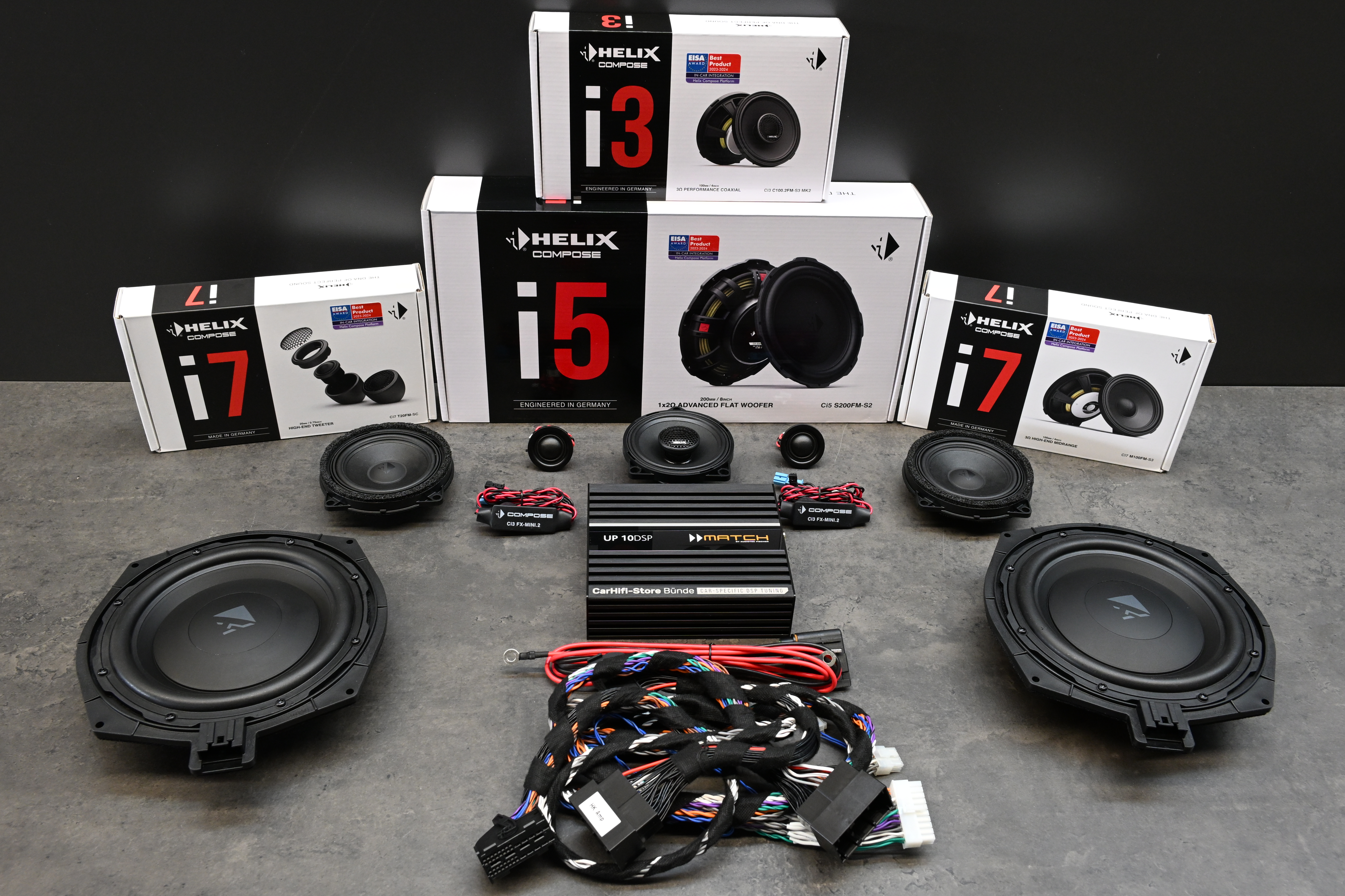 Beim Komplettsystem soundXTREME tauschen wir alle Frontlautsprecher aus, in den Türen werden die Helix COMPOSE i7 Mittel/Hochtoneinheiten verbaut, als Center reicht klanglich der i3 Koax, hier kann aber bei Bedarf auf 2-Wege i3, i5 oder i7 upgegradet werden. Als Untersitzsubwoofer kommen die i5 20cm Woofer zum Einsatz, angetrieben wird alles von der abschliessend perfekt eingemessenen Match UP 10DSP Endstufe. Zu 100% Plug&Play und komplett rückrüstbar.