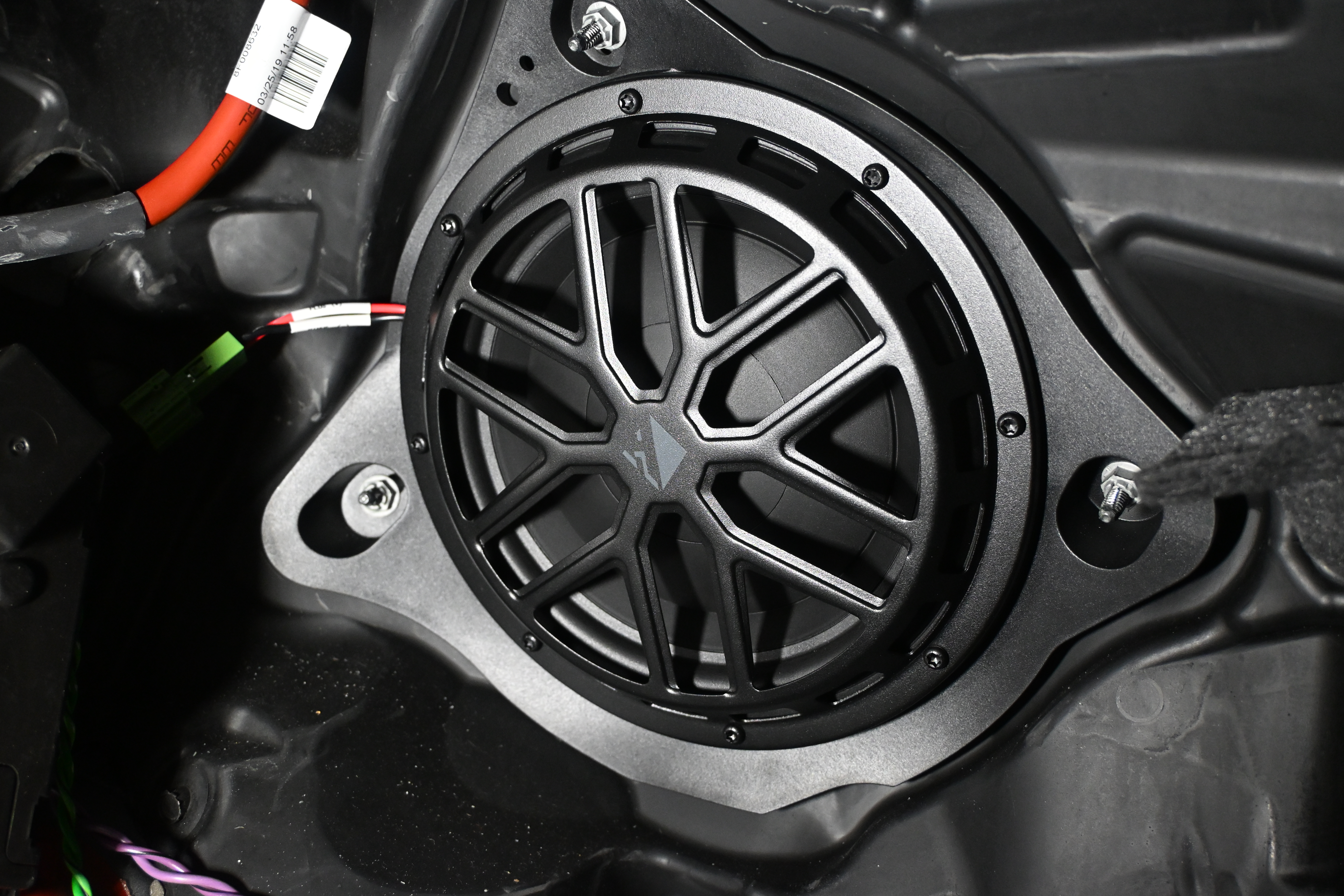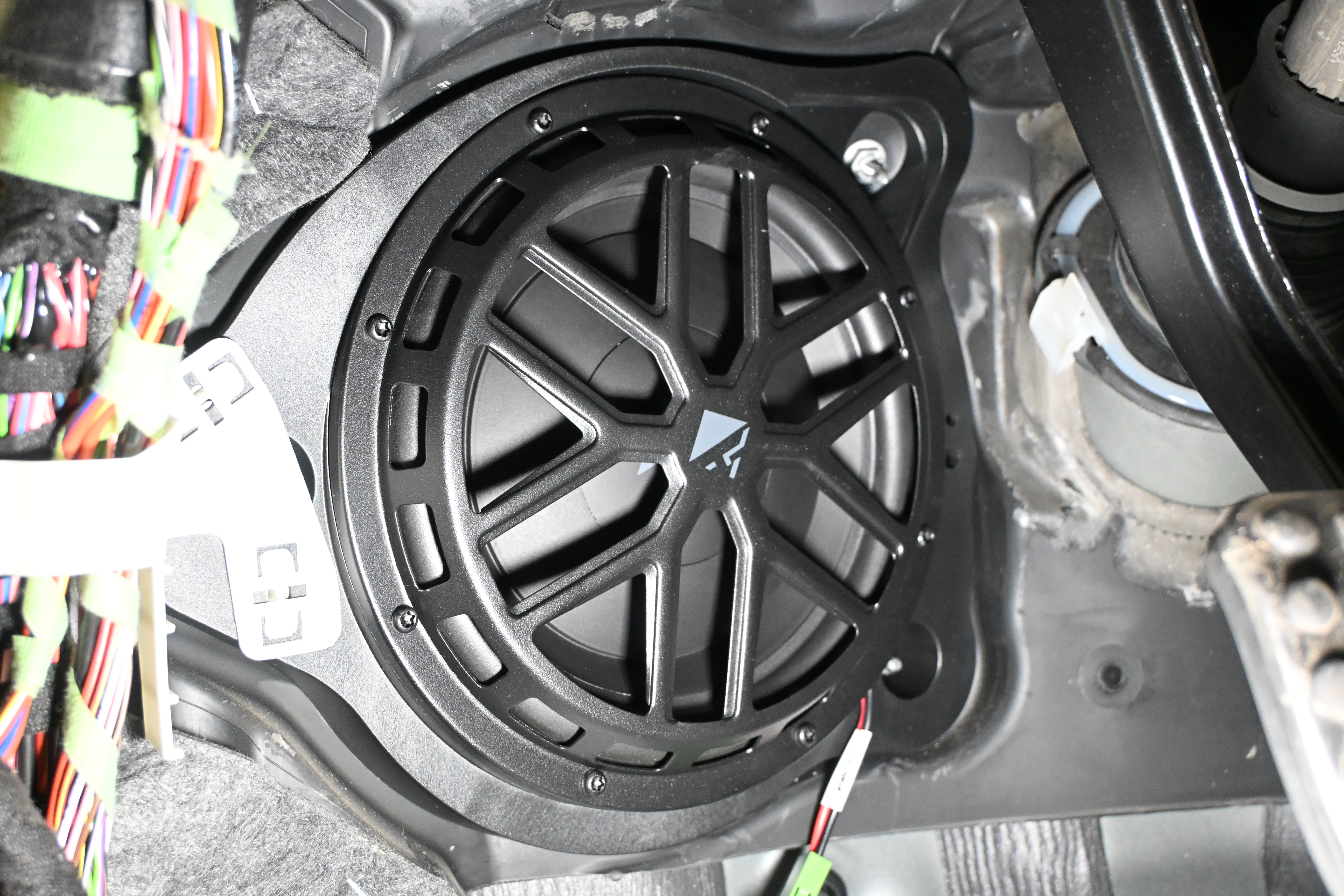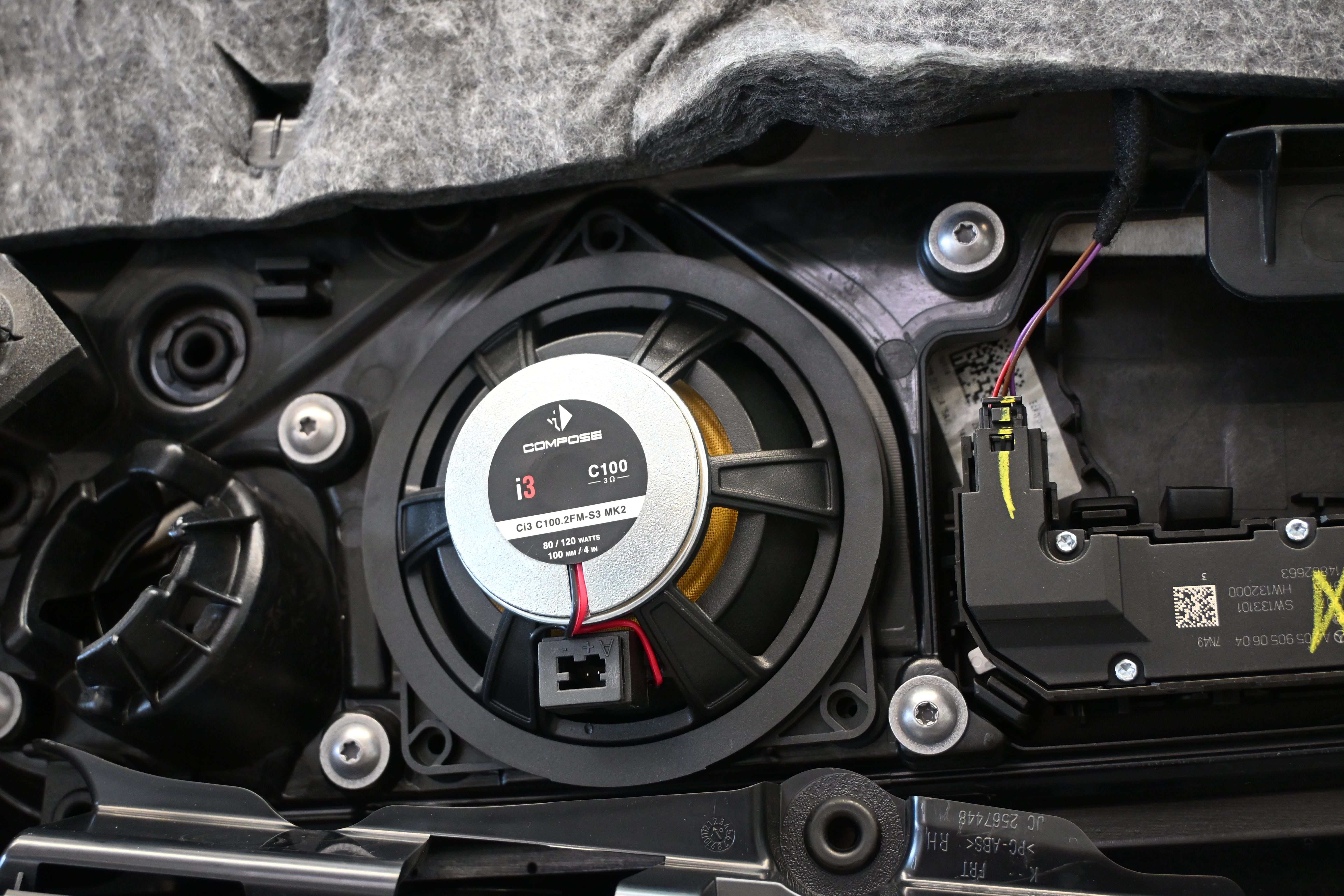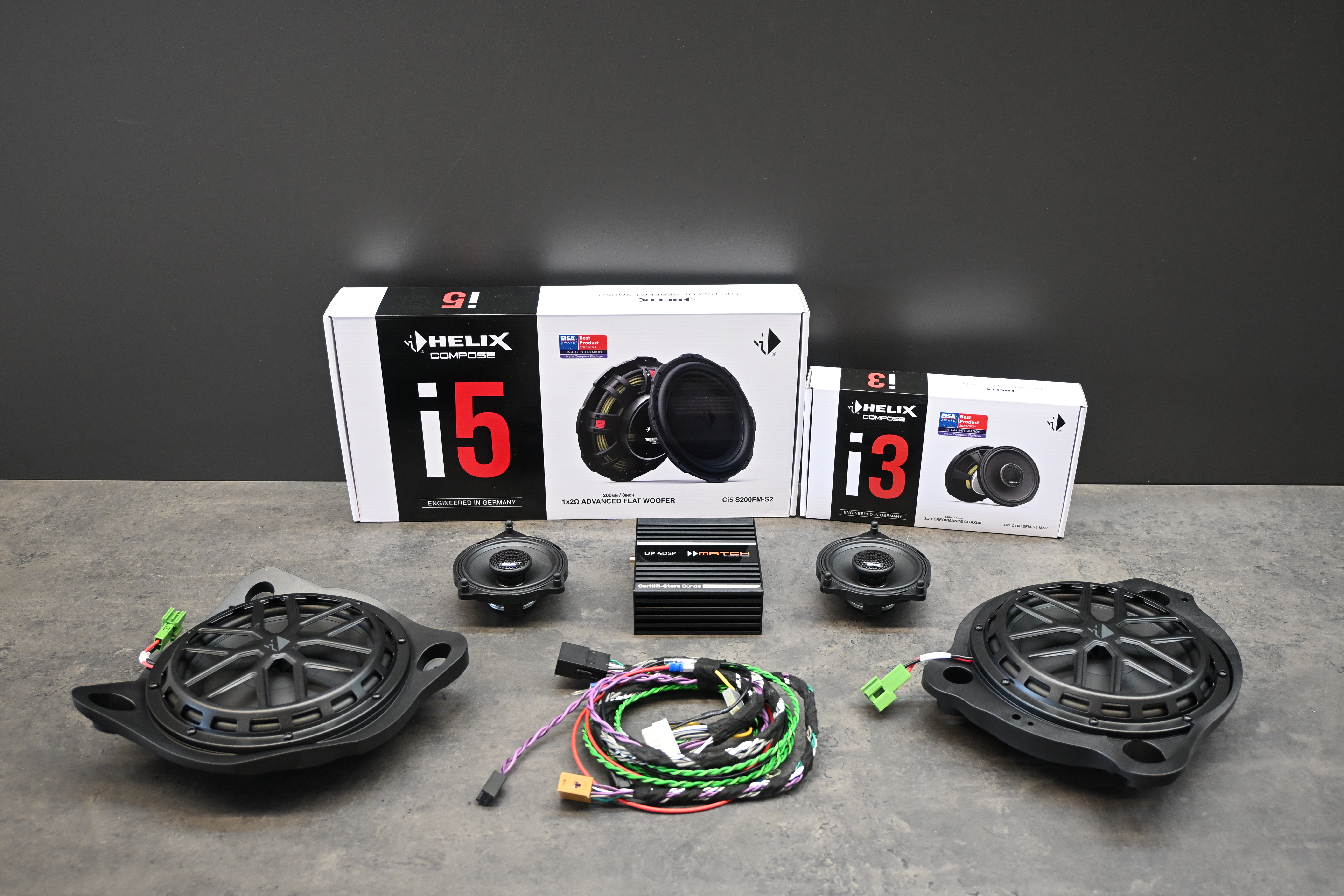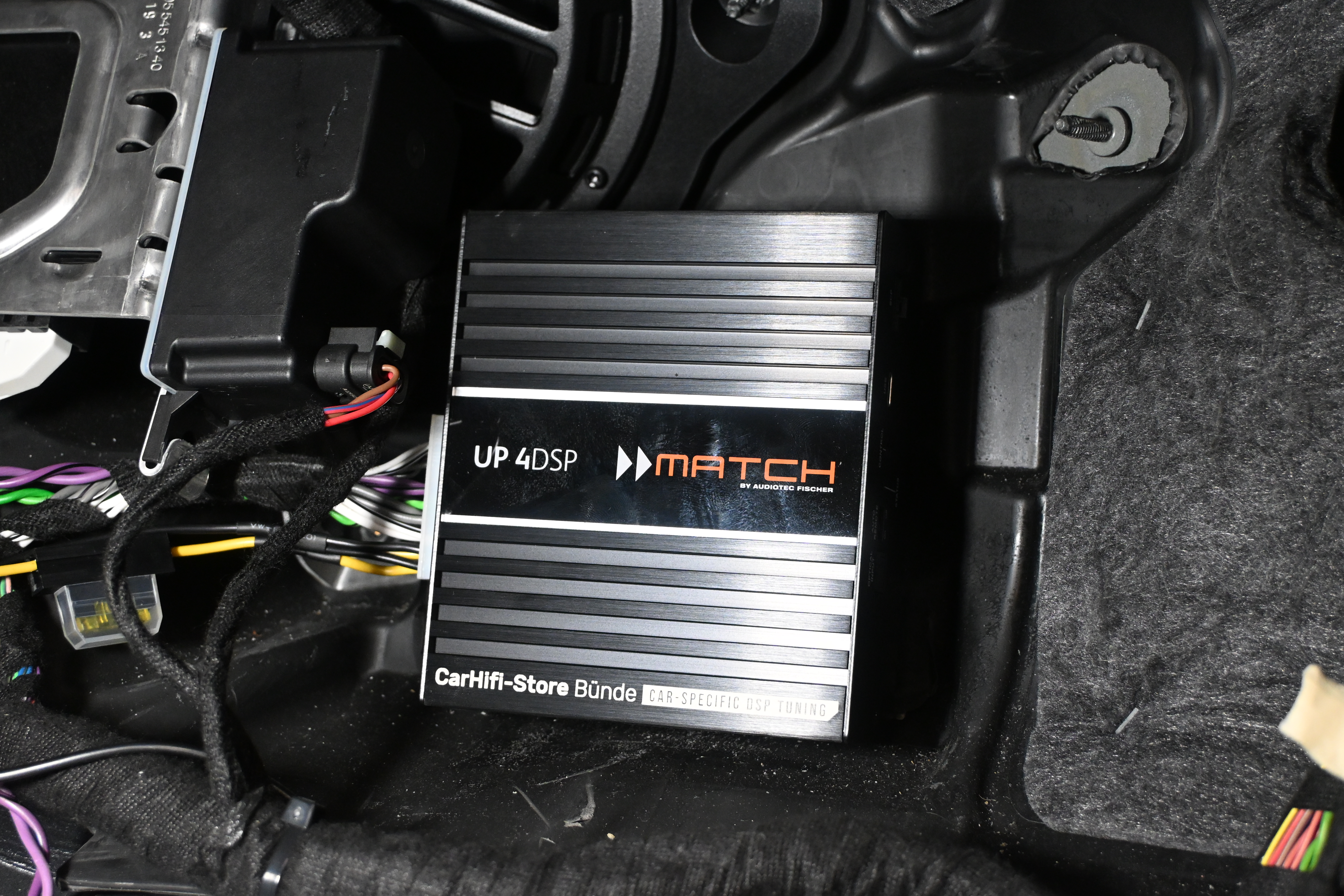 Wir haben hier unser 4-Kanal soundPRO System verbaut, dieses besteht im Cabrio und Coupé aus der Match UP 4DSP Endstufe mit angepasstem Kabelsatz, den Helix COMPOSE i5 Frontsubwoofern und dem i3 Koaxialsystem in den vorderen Türen. Alles ist steckerfertig vorbereitet und damit voll rückrüstfähig. Die neuen Subwoofer messen statt des original Teils 200mm im Durchmesser und natürlich kommen zwei zum Einsatz, denn auch auf der Fahrerseite ist ein Platz für den Woofer ab Werk vorgesehen.