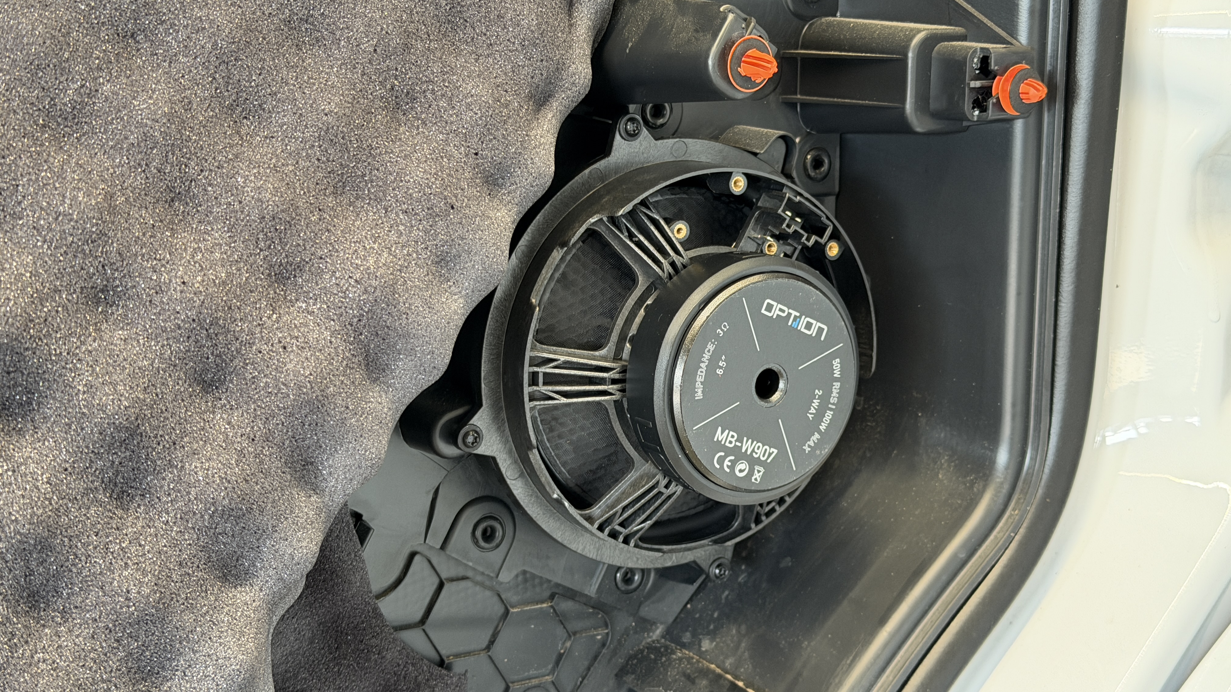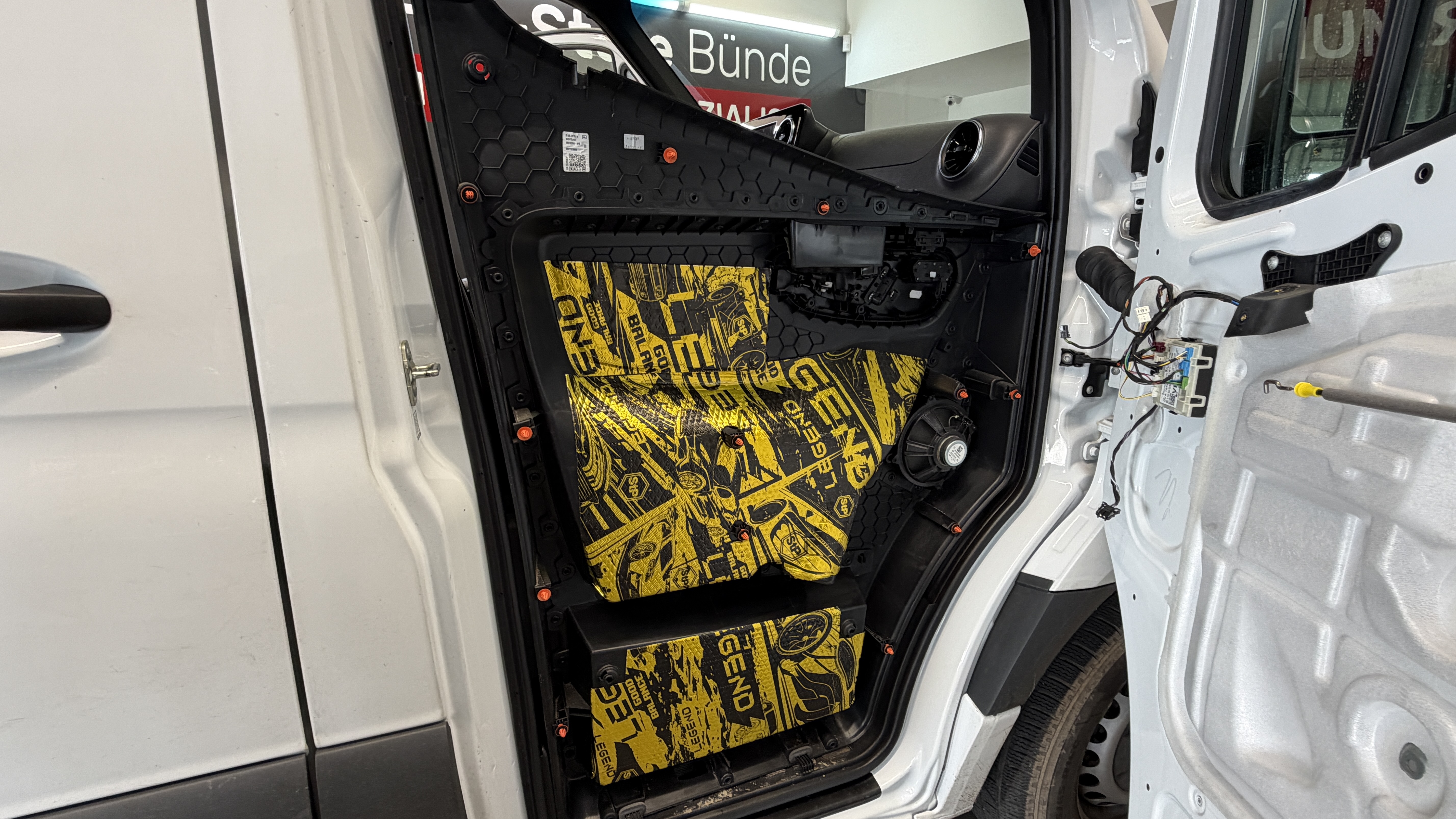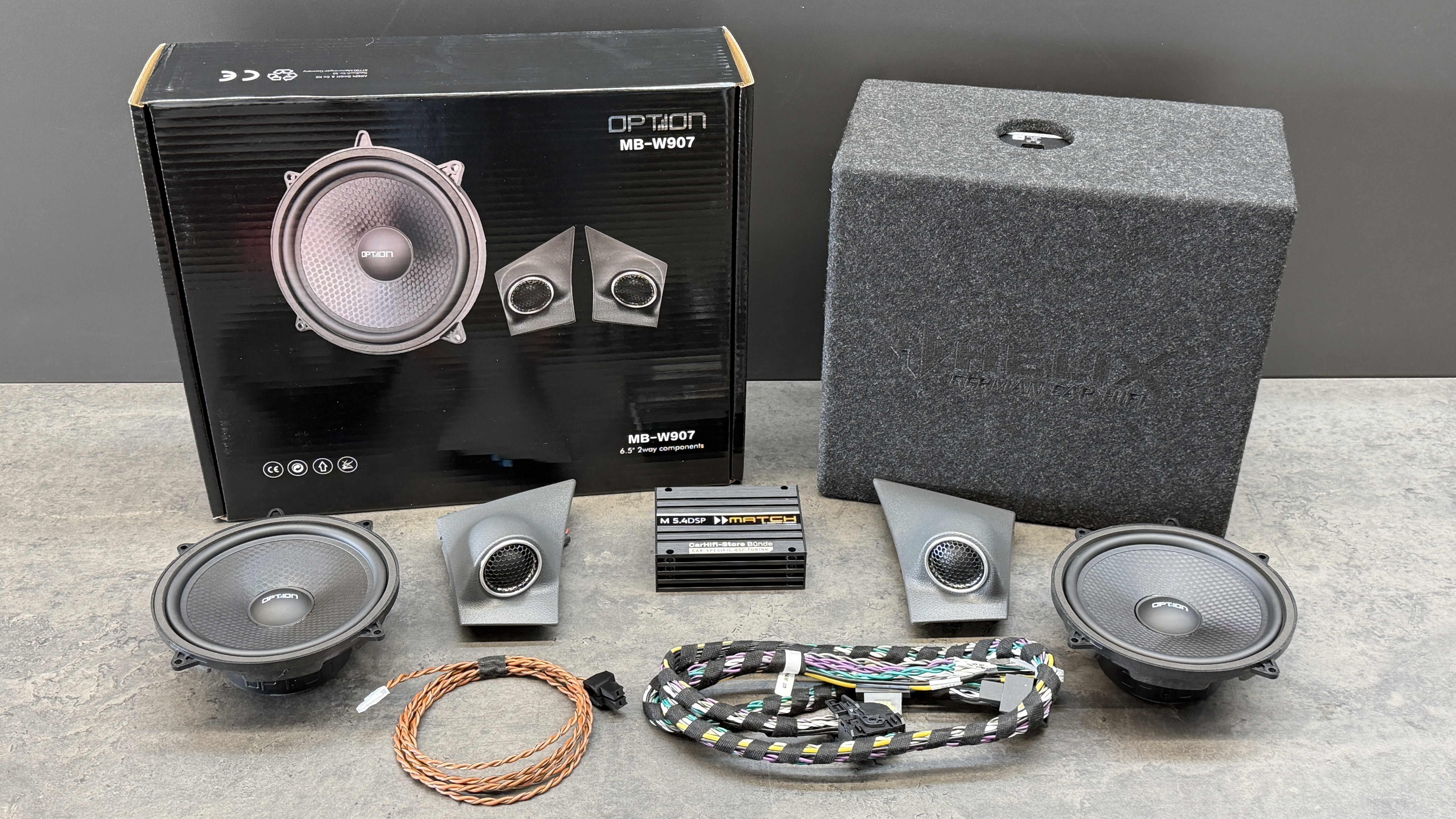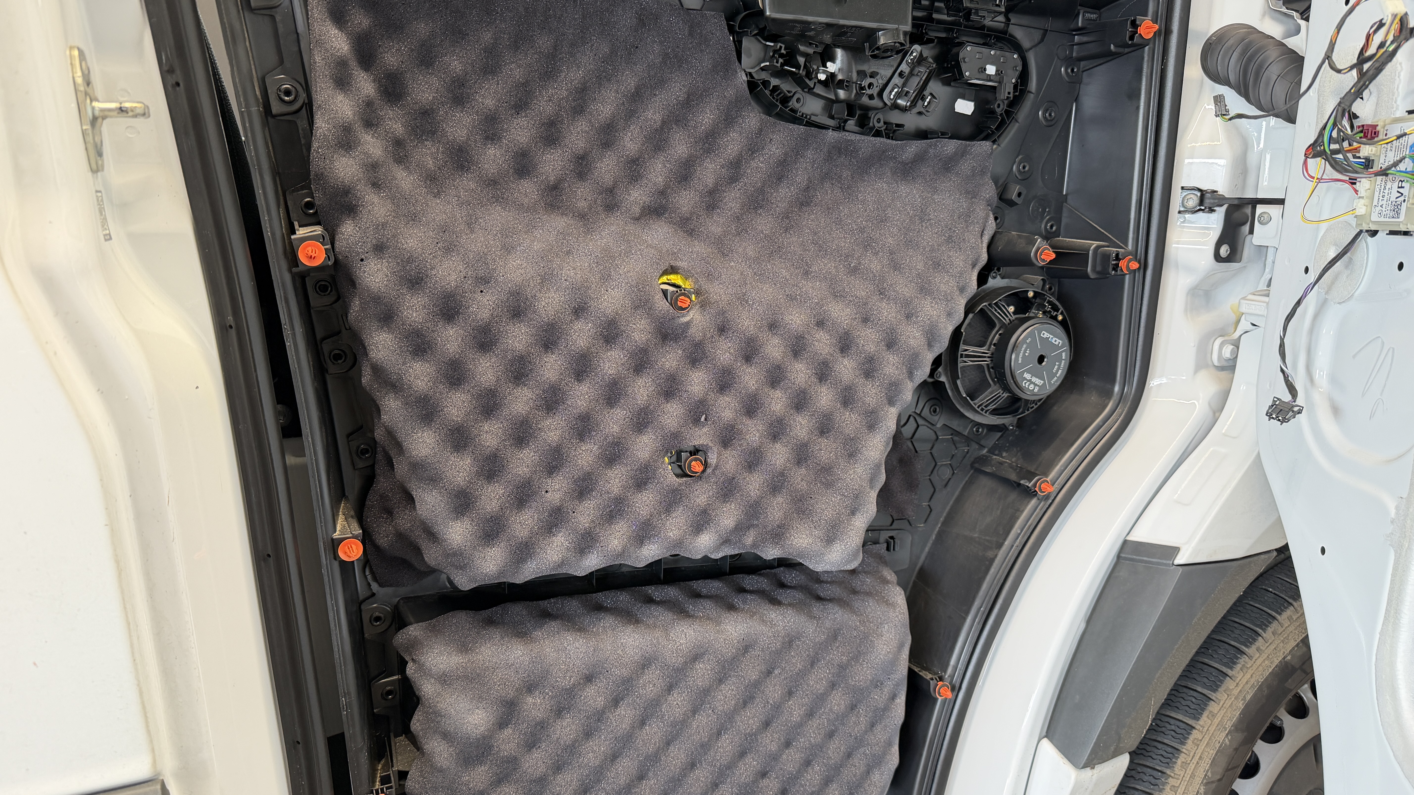 Mit dem Option MB-W907 kommt ein qualitativ hochwertiges Frontsystem in den Sprinter, die neuen Hochtöner sind zum Hörer ausgerichtet und machen optisch richtig was her. Die dazu gehörigen Tieftöner kommen in solide gedämmte Tür, das verhindert Klappern und ungewollte Rappelgeräusche, zudem kann der Tieftöner so mehr Bass produzieren. Damit es auch im Basskeller Unterstützung gibt wird der Helix IK E8.1 SVC unter der Sitzbank verbaut. Die Match M 5.4DSP Endstufe versorgt perfekt eingemessen alle Lautsprecher mit deutlich mehr Leistung.