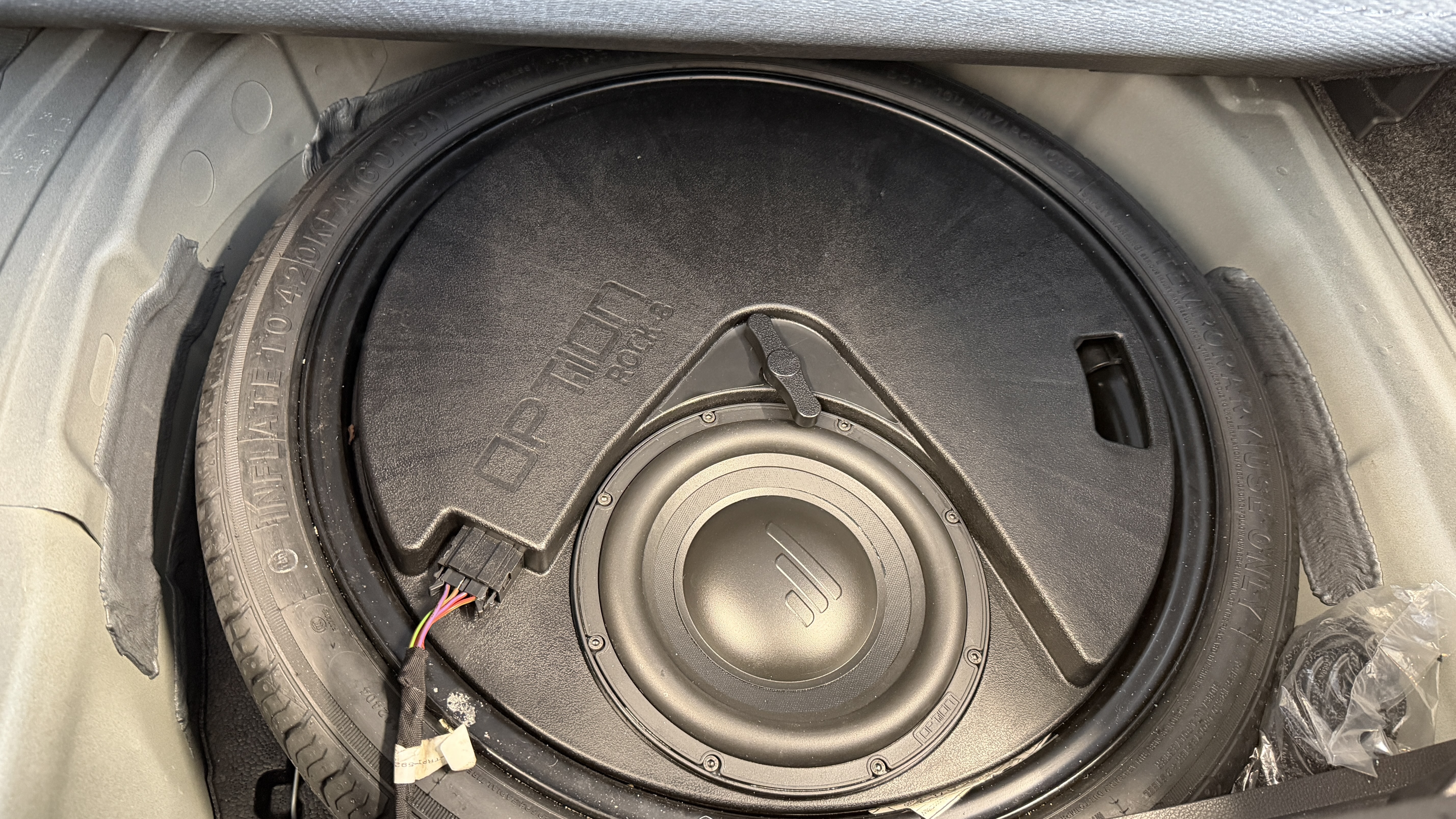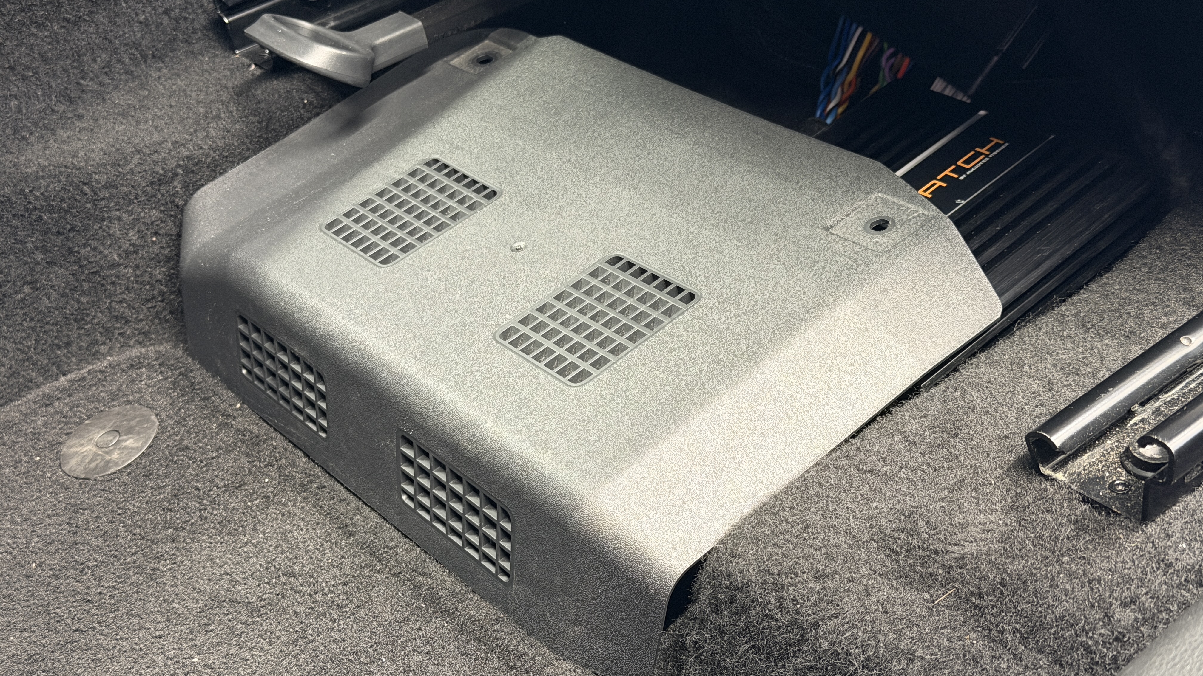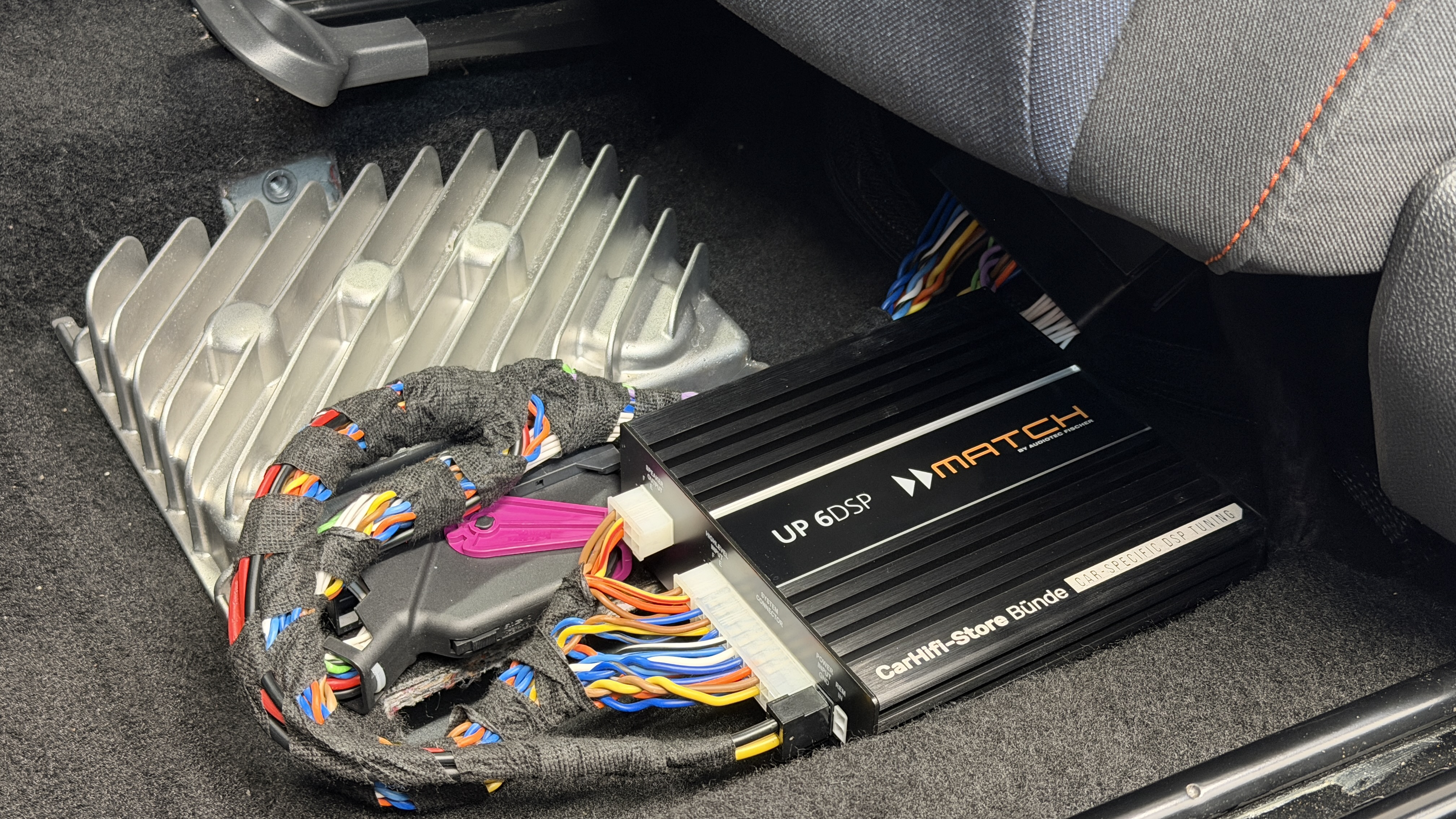 6-Kanal Upgrade Verstärker für alle Seat Beats Systeme. Dieser DSP Amp optimiert das aktive Frontsystem und den Subwoofer. Hier mit optionalem neuem Woofer als Ersatz für den ab Werk verbauten im Notrad.