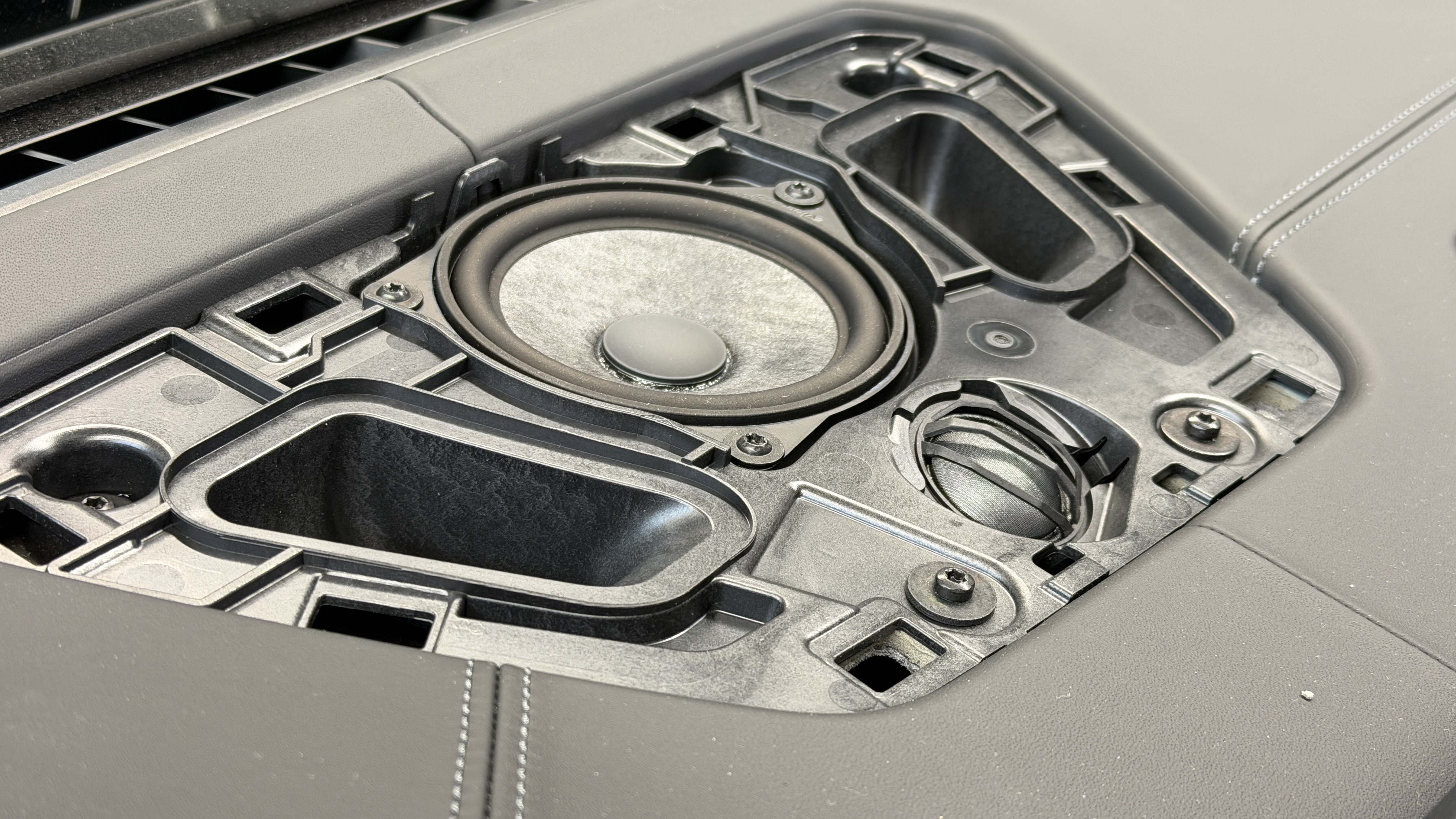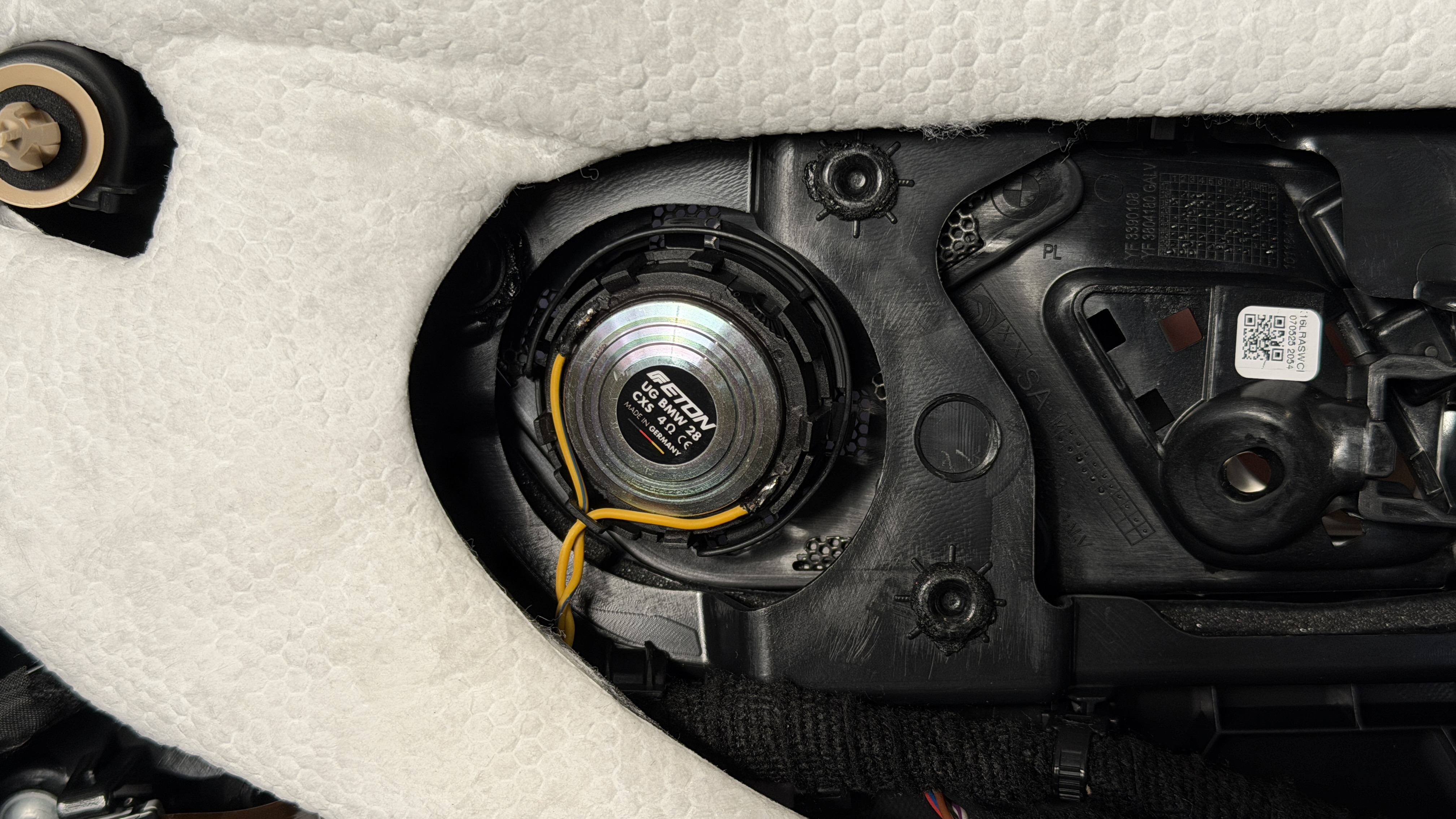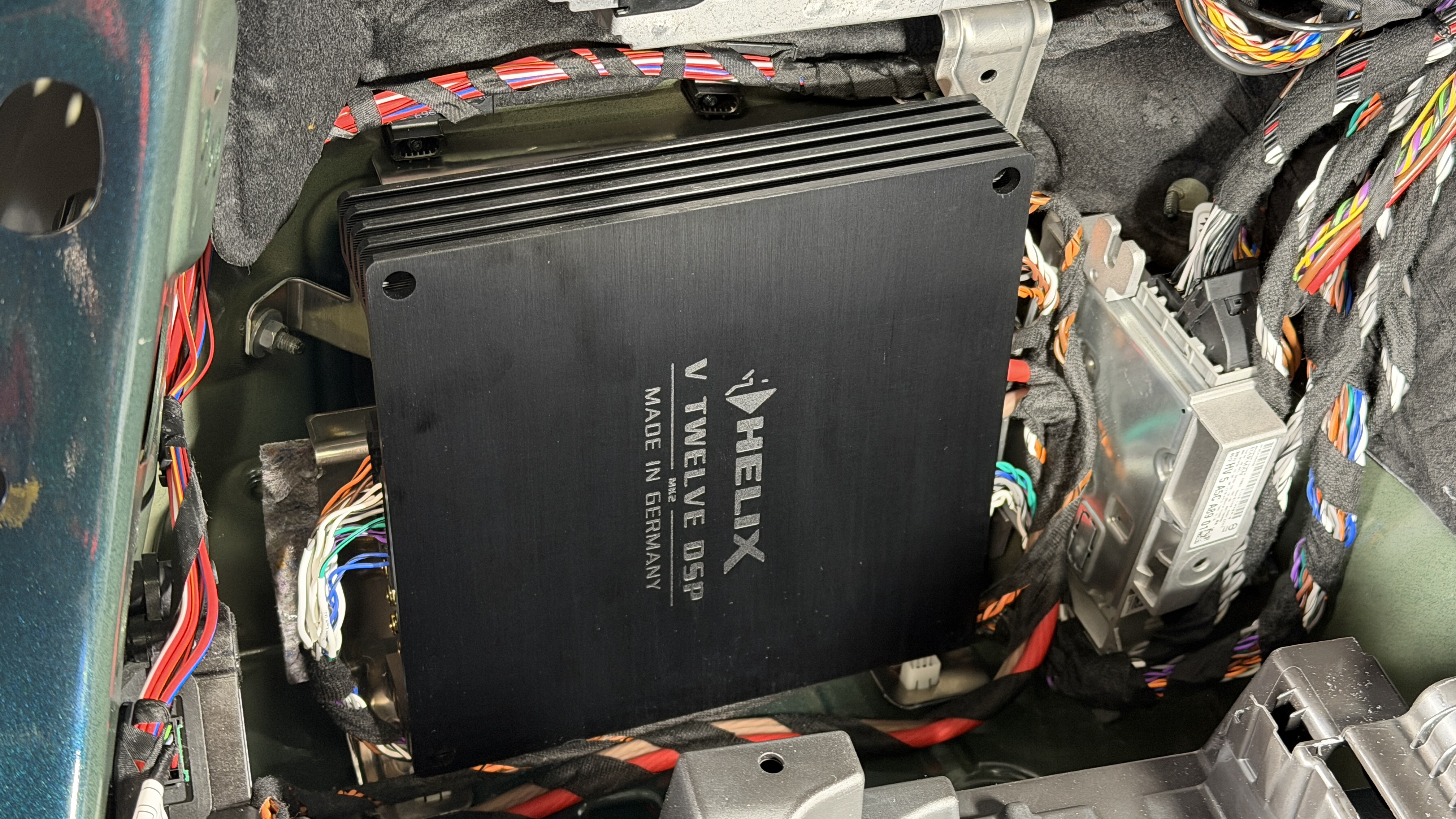 Das Harman Kardon System im BMW M3 G80/81 besteht aus 2-Wege Komposystemen vorn und hinten in der Tür, einem 2-Wege Centerlautsprecher, 2 x 20cm Untersitzsubwoofern und den hinteren 10cm Surroundlautsprechern. Bis auf letztgenannte haben wir hier alle Lautsprecher gegen die Eton Ultimate Serie getauscht, dazu kam die Helix V-Twelve DSP Endstufe, welche hinter dem RAM-HK System mit einem eigens angefertigten Kabelbaum Plug and Play alle Signale abgreift und wieder ins System einspeist. Wichtig für uns bleibt immer die volle Rückrüstbarkeit, die auch in diesem Falle zu 100% gegeben ist.