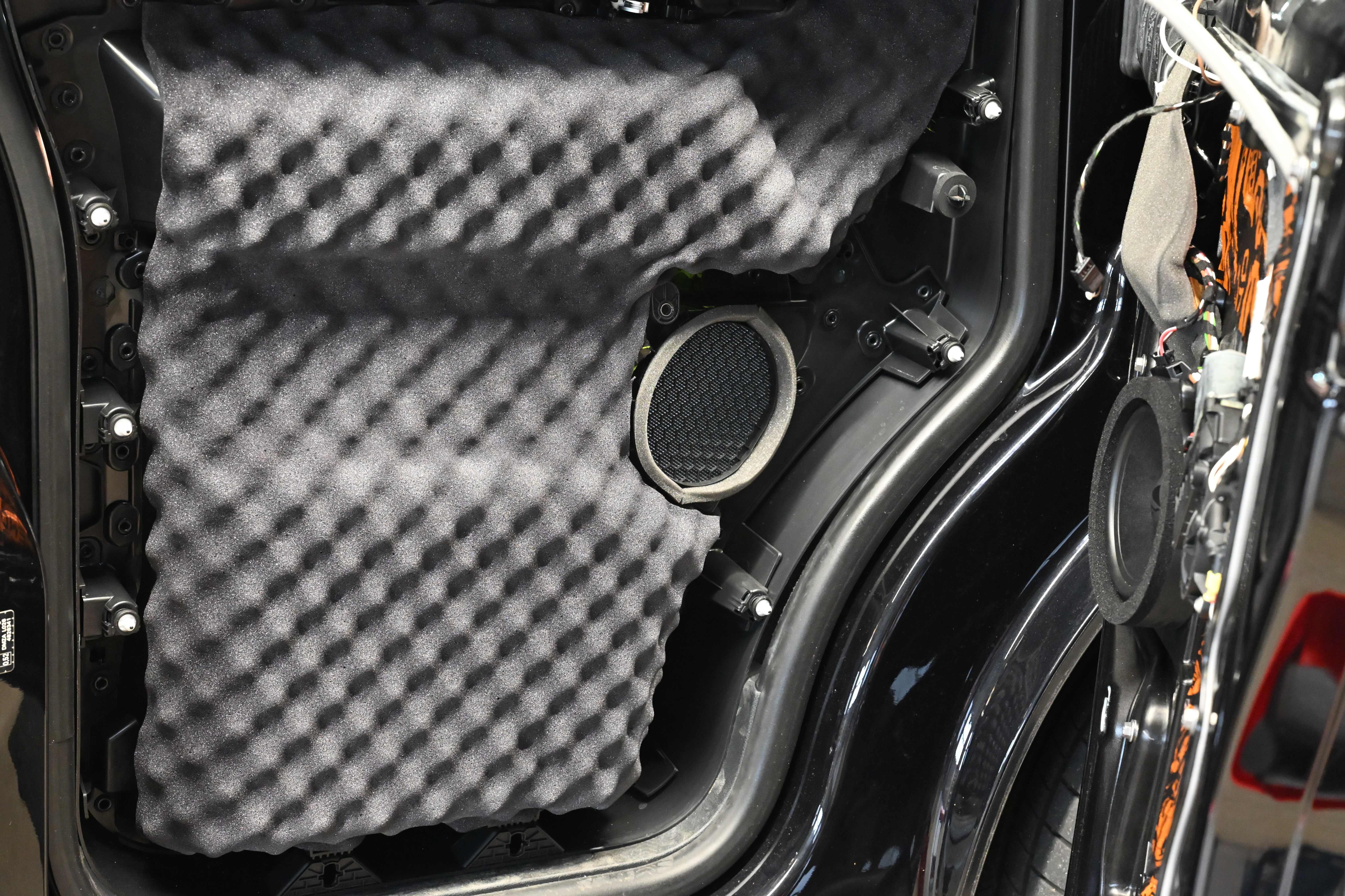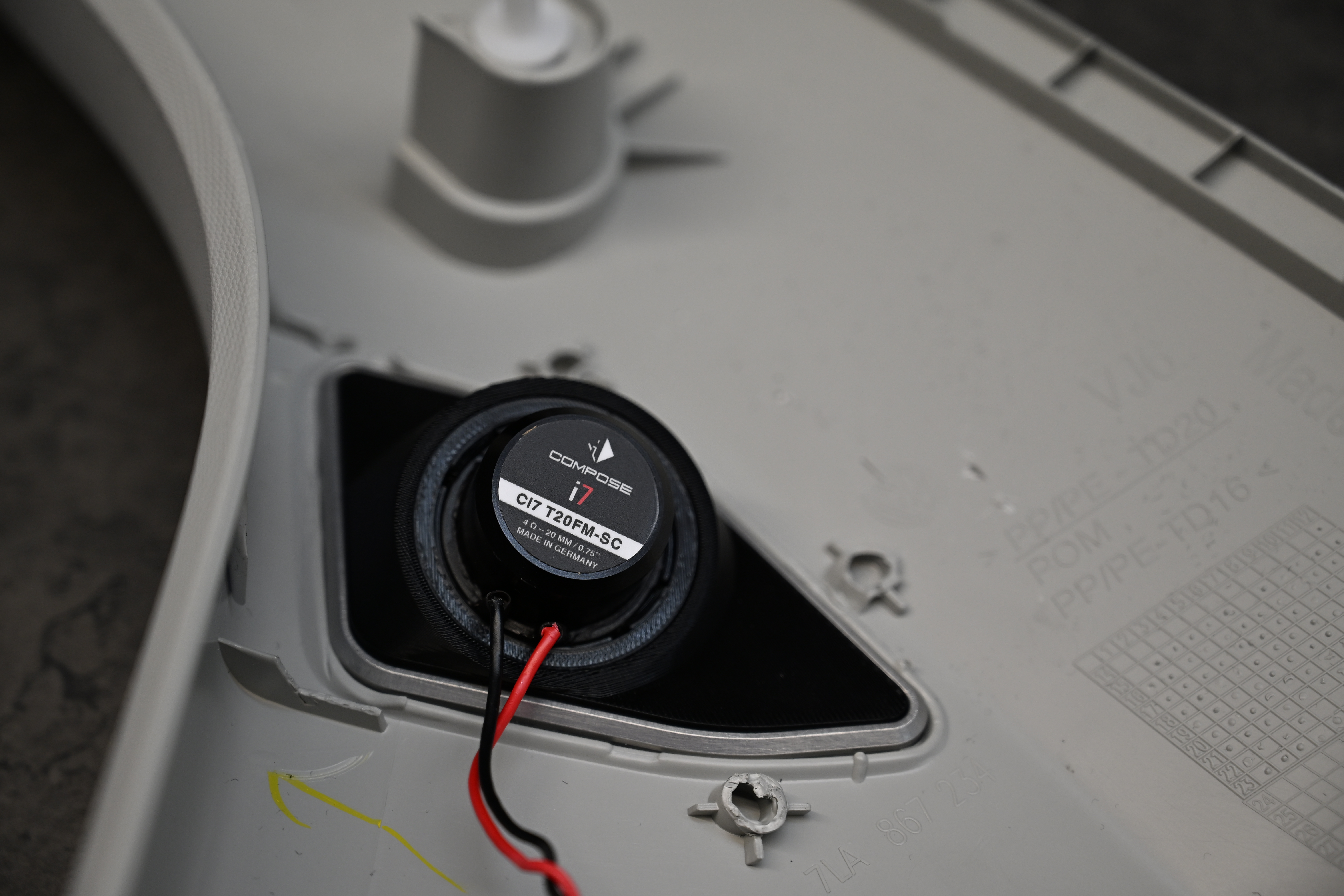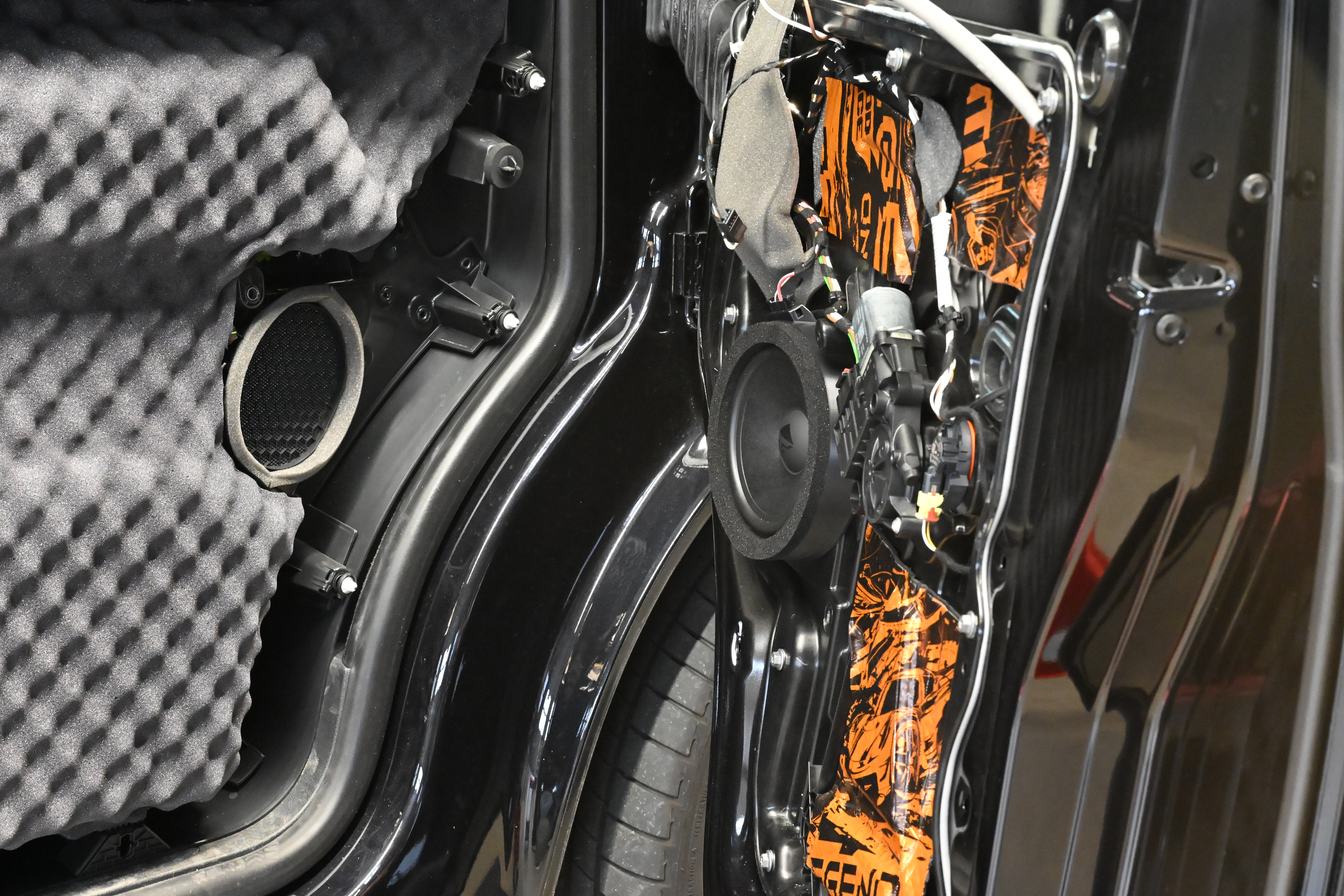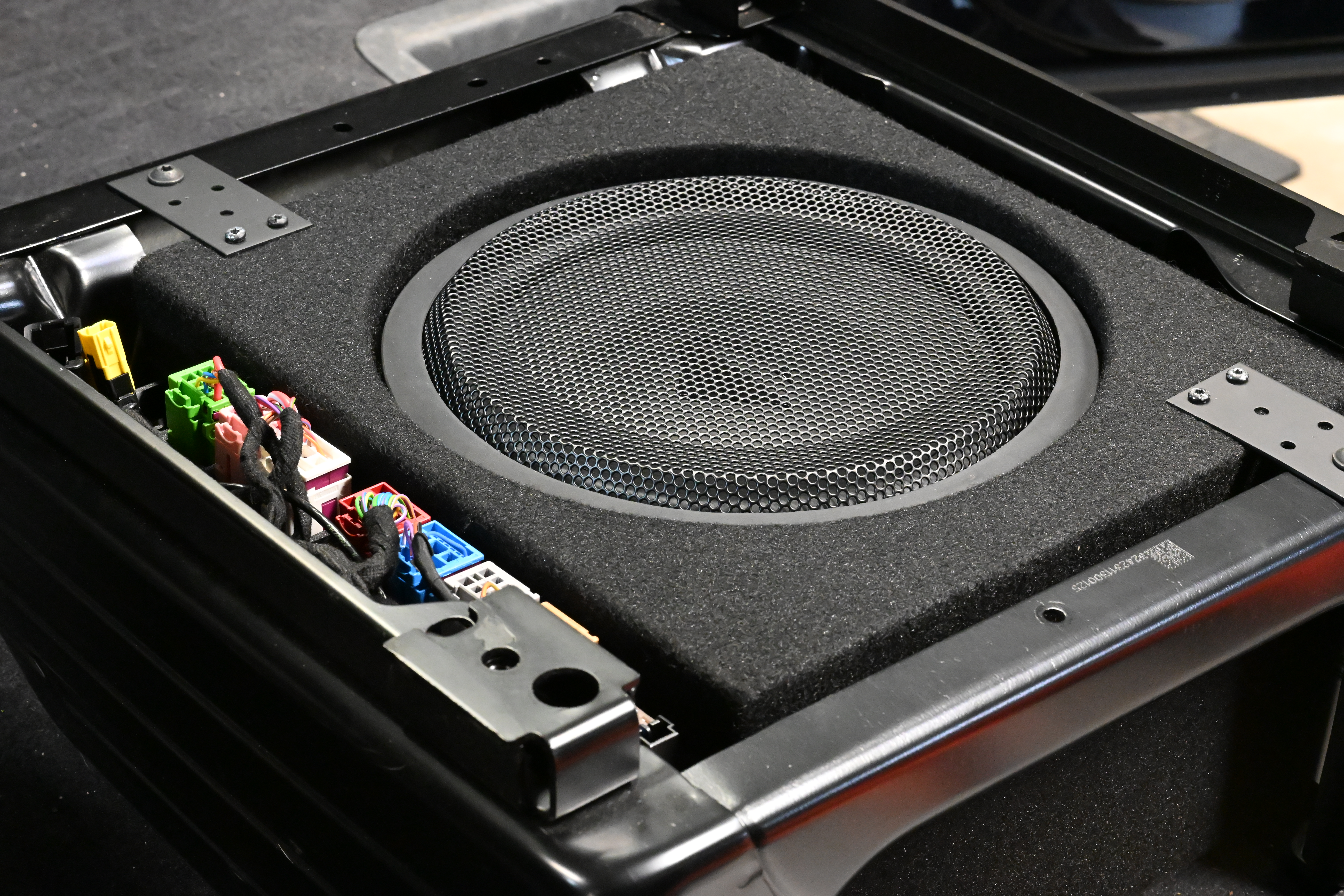 Als erstes kommt eine richtig solide Türdämmung dran, wir dämmen hier mit STP und Comfort Mats Produkten für ein optimales Ergebnis. Die COMPOSE i7 W165FM-3 Tieftöner werden auf unseren FlexMount165 Adaptern inkl. Terminal in der Tür verschraubt und bieten dem Lautsprecher eine optimale Festigkeit. Subwoofer und Endstufe wandern unter den Beifahrersitz, hier ist auch die VW Drehkonsole kein Problem. Damit die unter dem Sitz verbauten Steckverbindungen wieder ordentlichen Halt finden werden diese mit unserem Steckerhalter am Subwoofer sauber positioniert. Für den Helix COMPOSE i7 Hochtöner gab es in diesem Fahrzeug unsere speziell für den T6 und T6.1 angefertigten CNC Gitter - mit den großen Hexagon Löchern kann der Hochtöner deutlich freier aufspielen als hinter dem original Gitter.