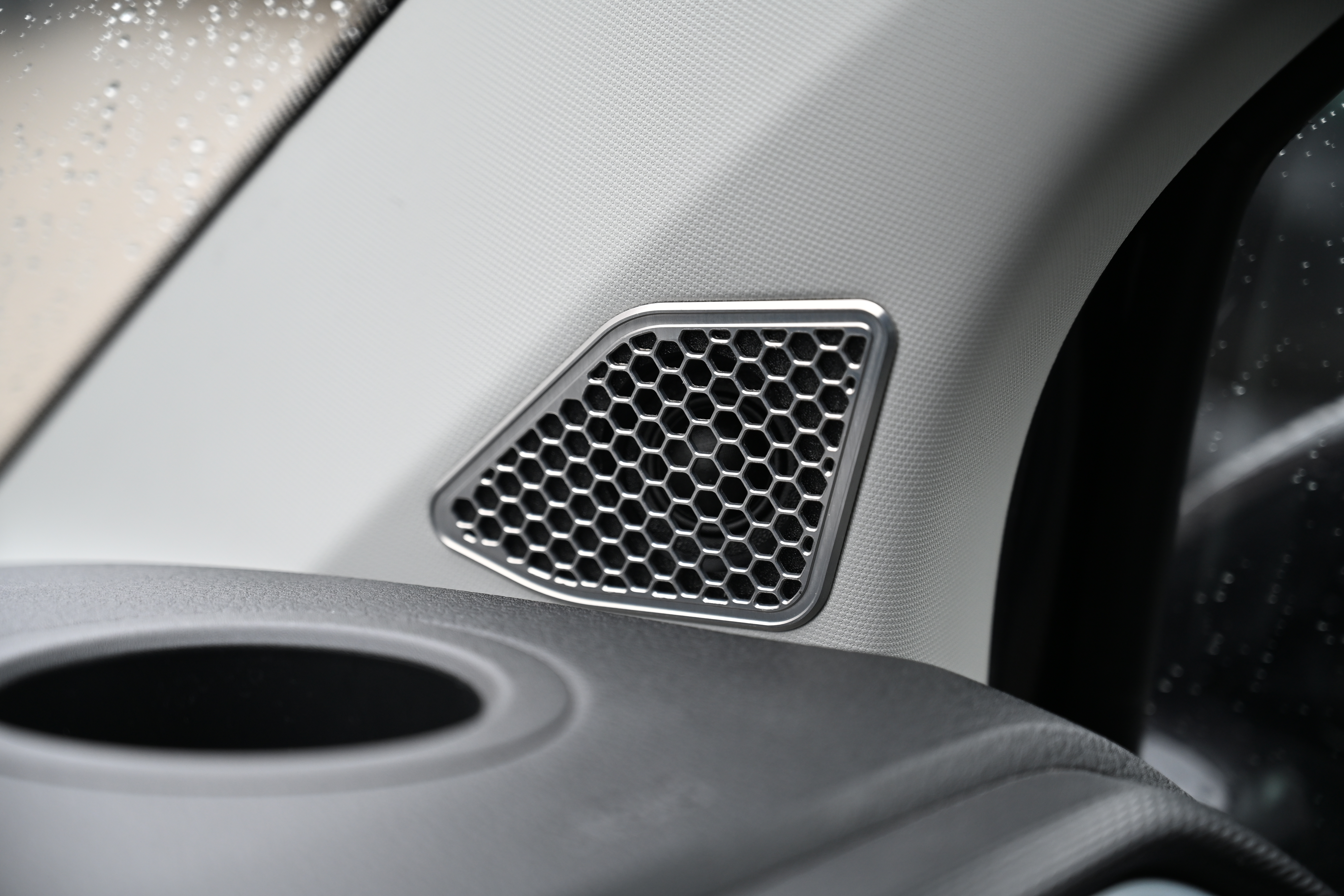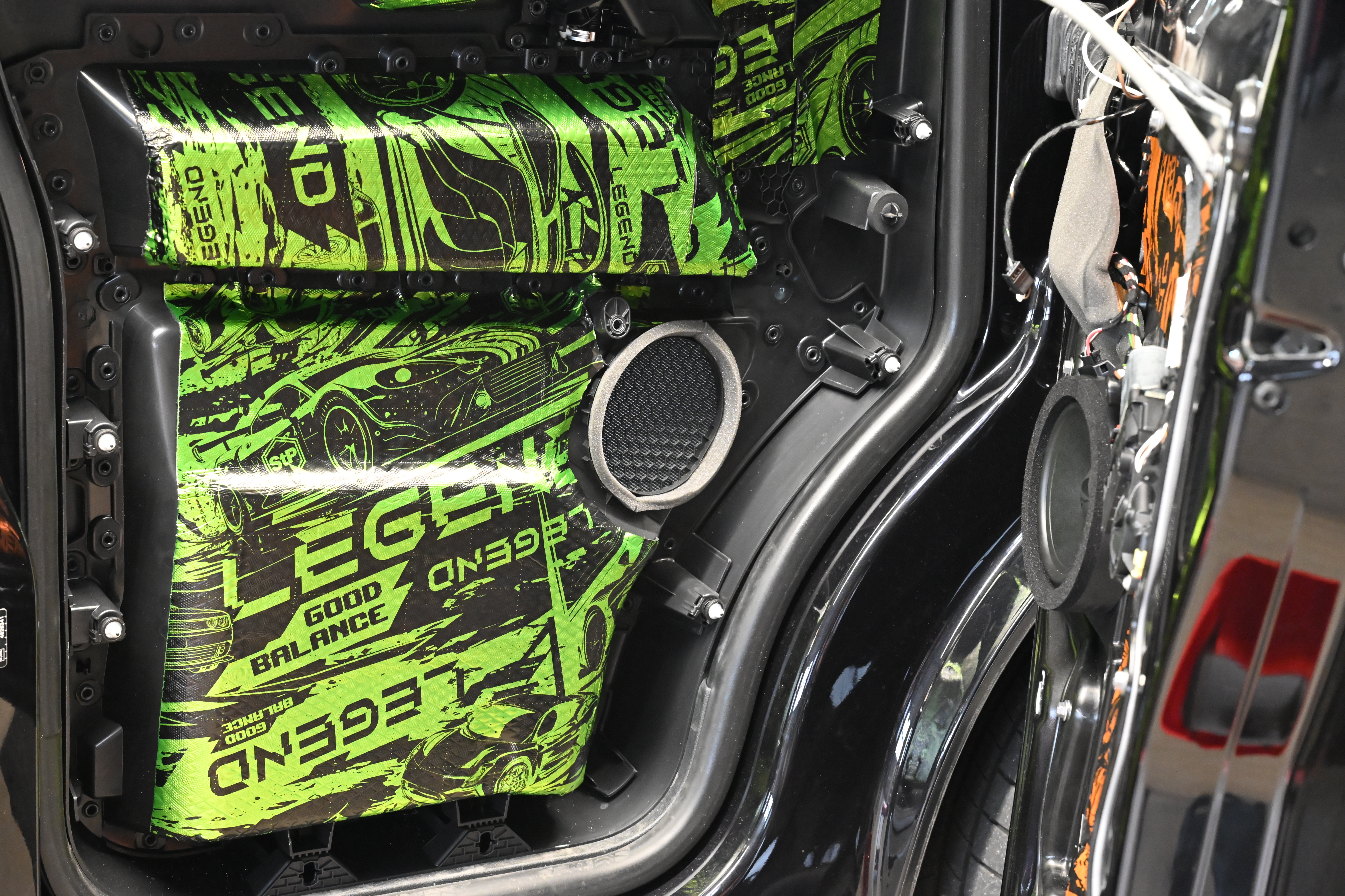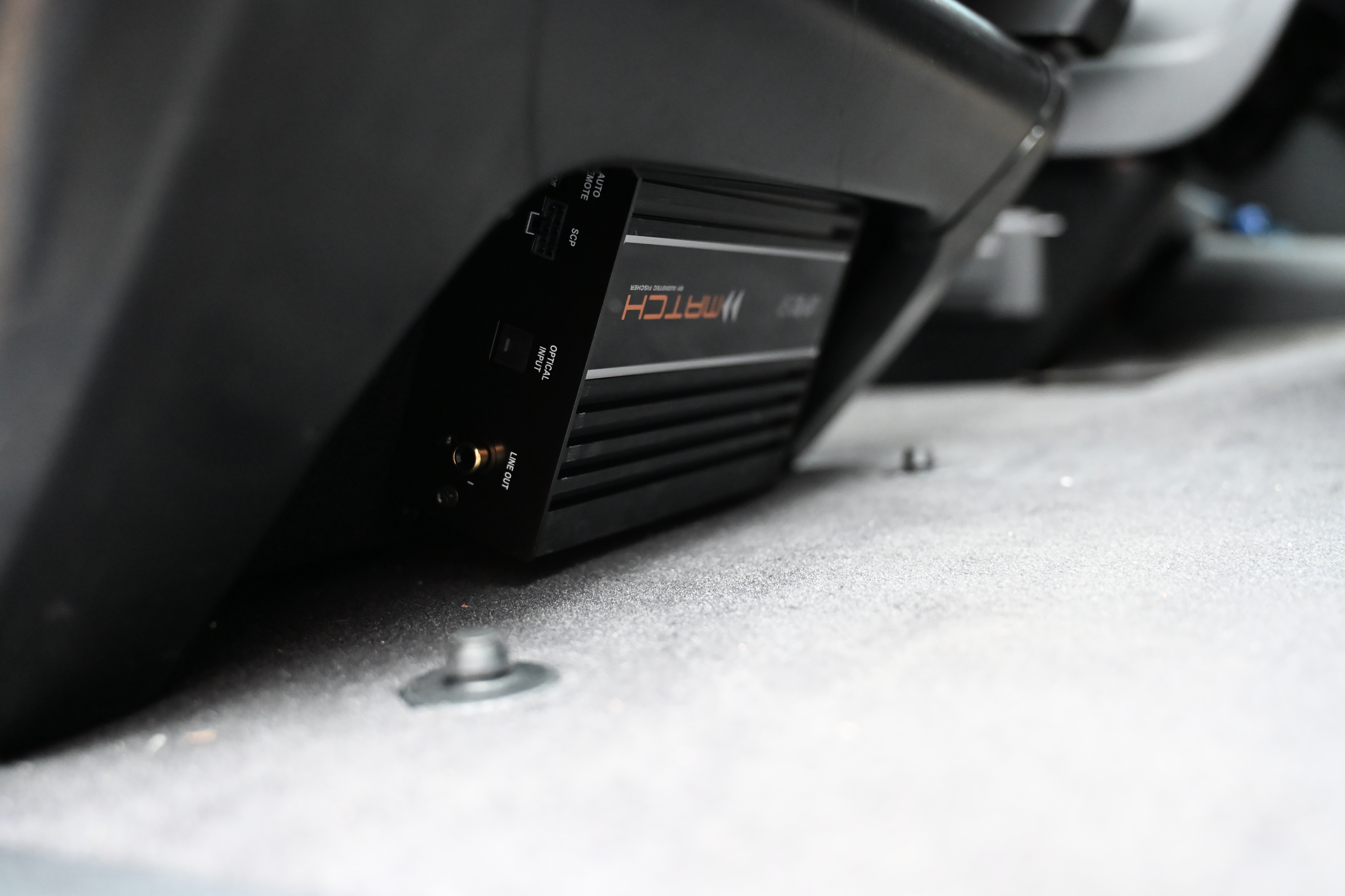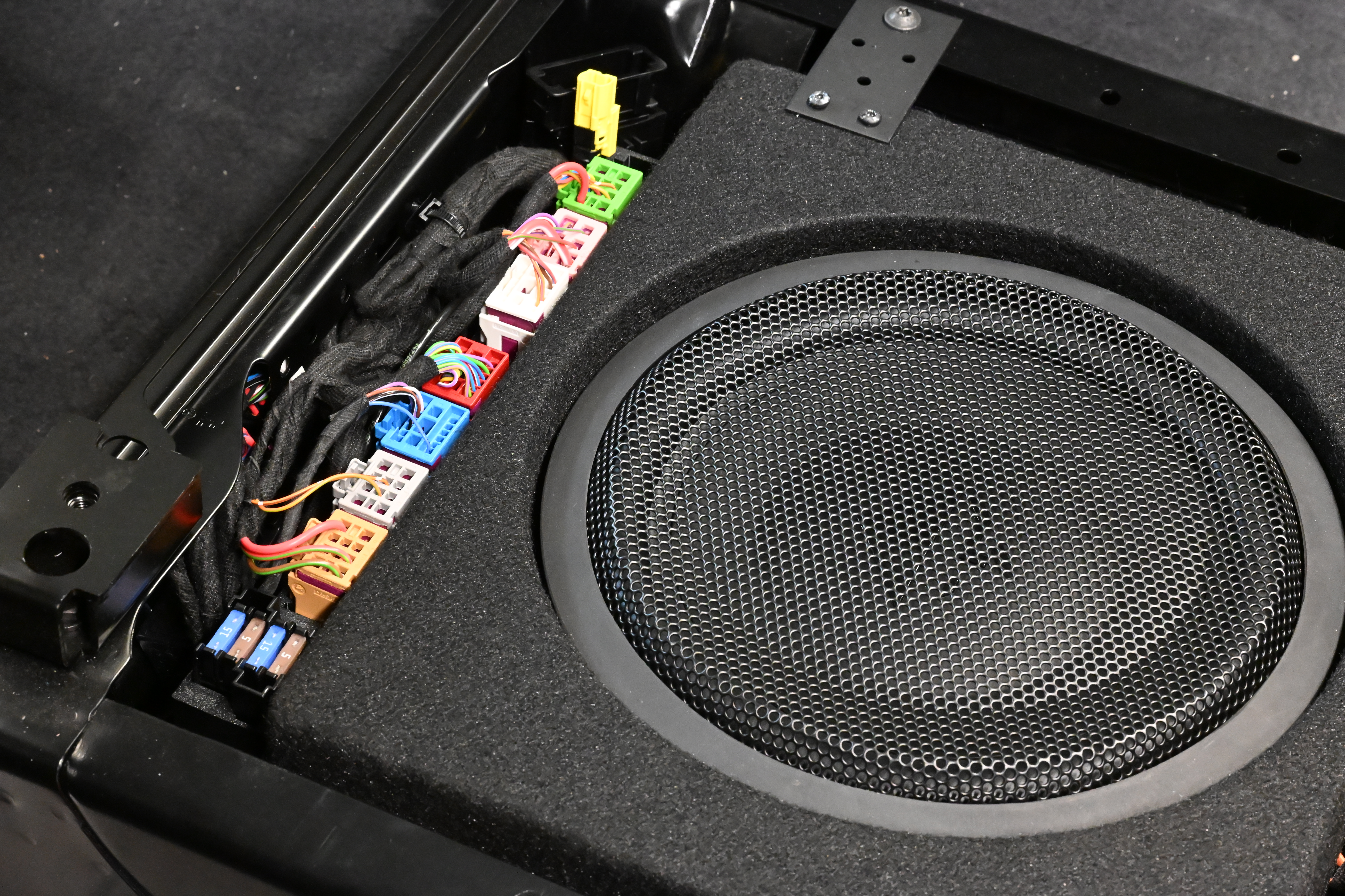 Als erstes kommt eine richtig solide Türdämmung dran, wir dämmen hier mit STP und Comfort Mats Produkten für ein optimales Ergebnis. Die COMPOSE i7 W165FM-3 Tieftöner werden auf unseren FlexMount165 Adaptern inkl. Terminal in der Tür verschraubt und bieten dem Lautsprecher eine optimale Festigkeit. Subwoofer und Endstufe wandern unter den Beifahrersitz, hier ist auch die VW Drehkonsole kein Problem. Damit die unter dem Sitz verbauten Steckverbindungen wieder ordentlichen Halt finden werden diese mit unserem Steckerhalter am Subwoofer sauber positioniert. Für den Helix COMPOSE i7 Hochtöner gab es in diesem Fahrzeug unsere speziell für den T6 und T6.1 angefertigten CNC Gitter - mit den großen Hexagon Löchern kann der Hochtöner deutlich freier aufspielen als hinter dem original Gitter.