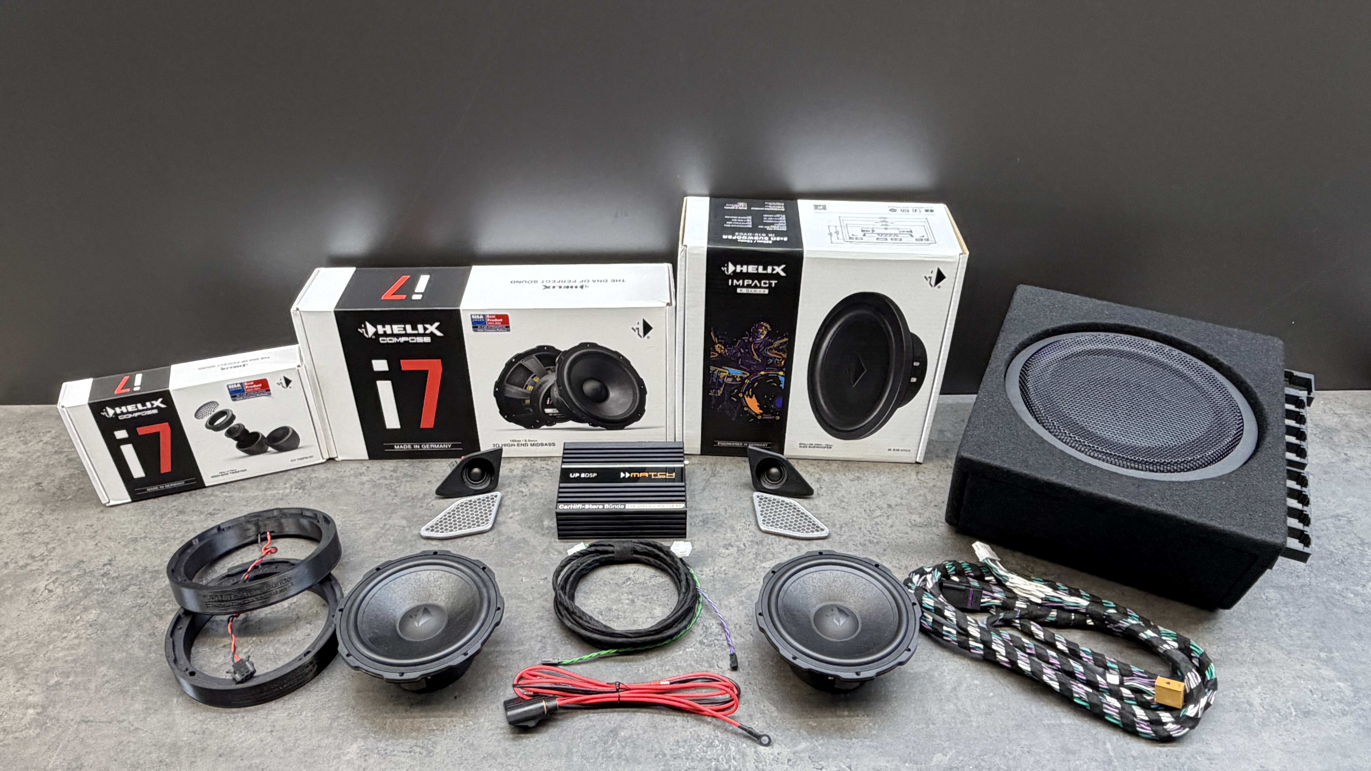 "Das sind Welten" - und das sagt nicht der erste Kunde nach dem Probehören. "Kein vergleich zu vorher" kommt als nächstes. Ja, das System spielt durch den Aktivbetrieb, die sehr hochwertigen Komponenten und in diesem Falle noch zusätzlich durch die optisch und technisch optimierten Gitter unglaublich aufgelöst, dynamisch und Druckvoll. Der 25cm Subwoofer liefert bei Bedarf jederzeit sattes Bassfundament und die Helix COMPOSE i7 Kombination sorgt für erstklassiges Frontstaging - woran die perfekt eingemessene Match UP 8DSP nicht ganz unschuldig ist :o)