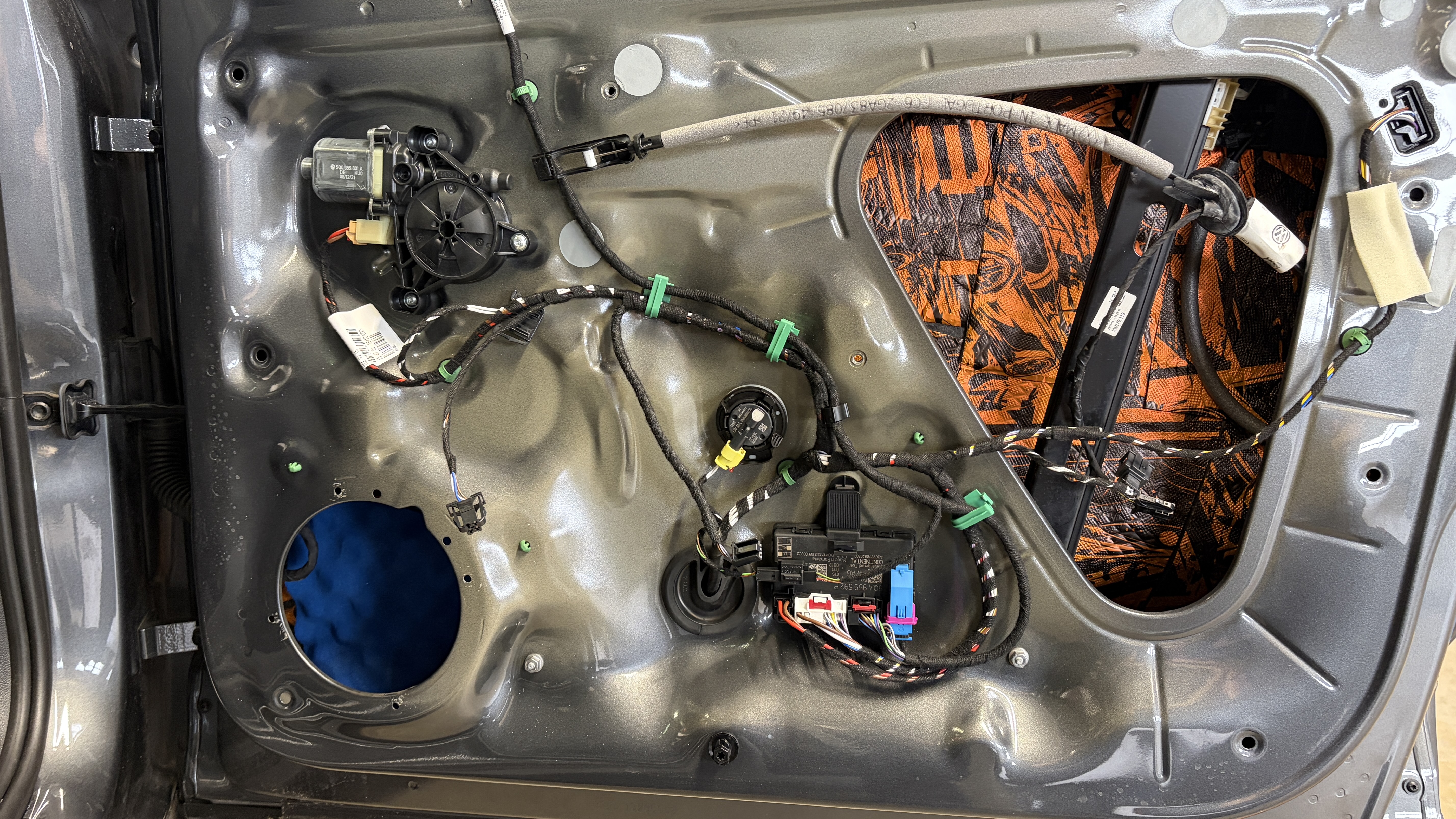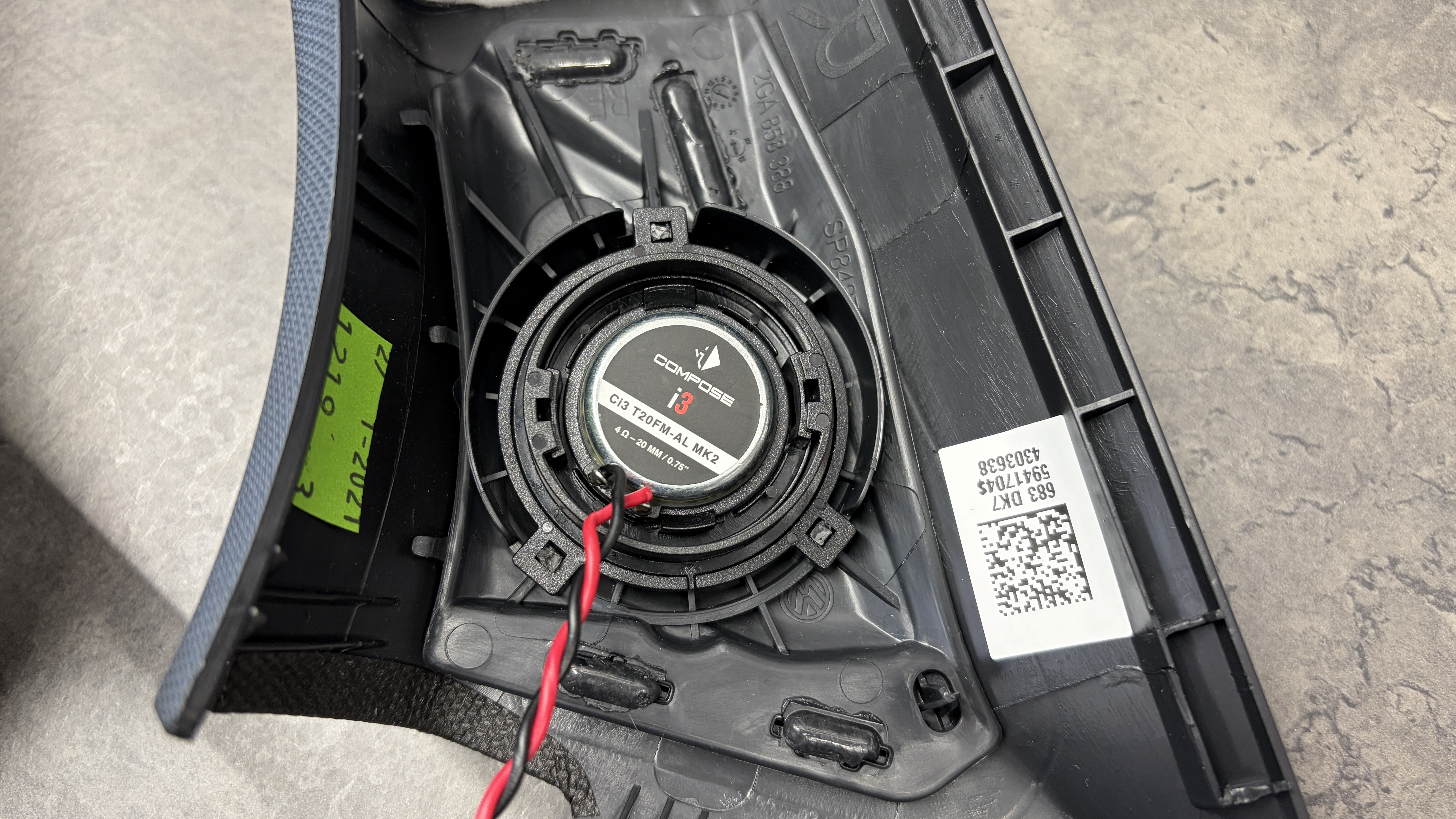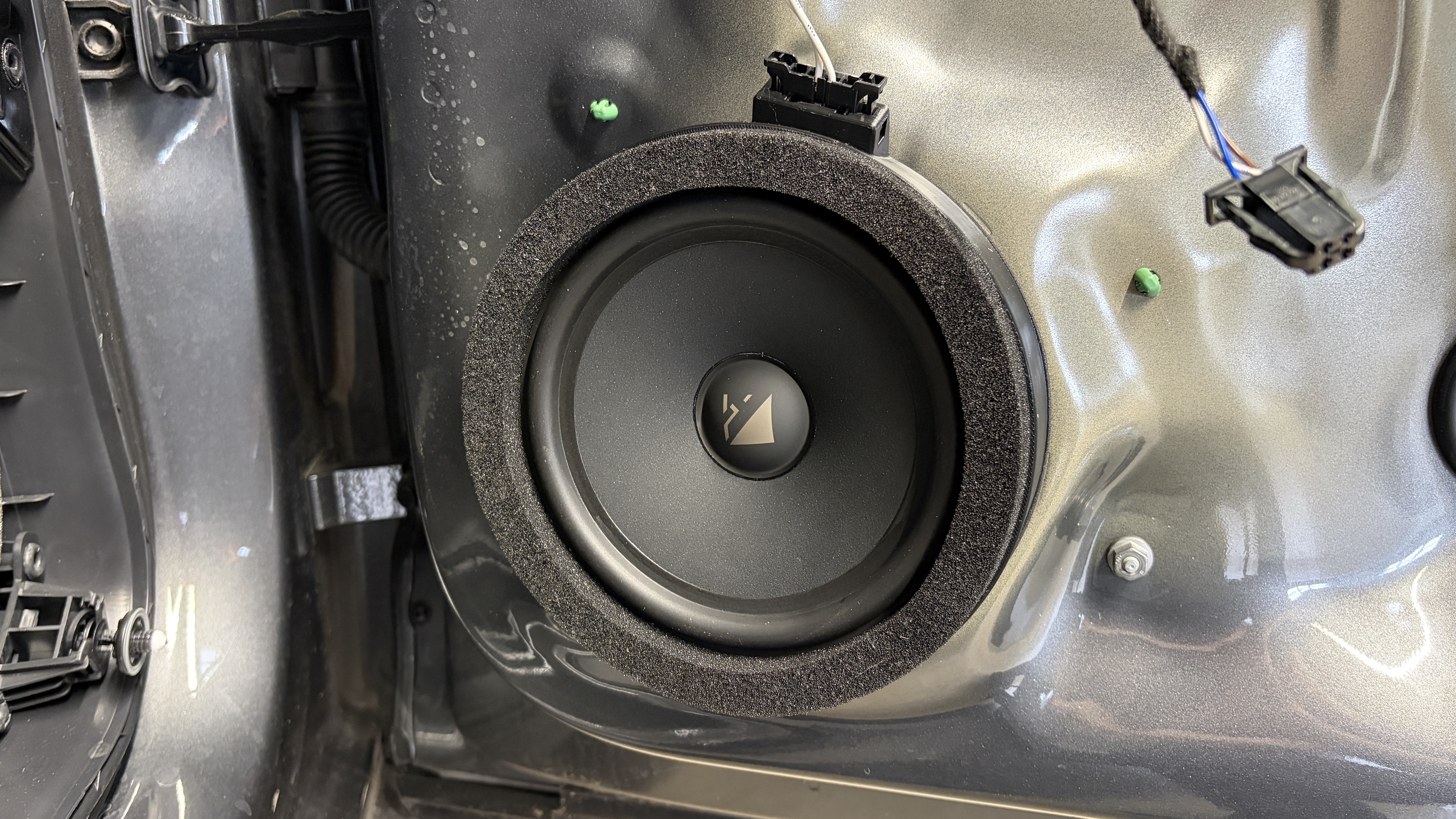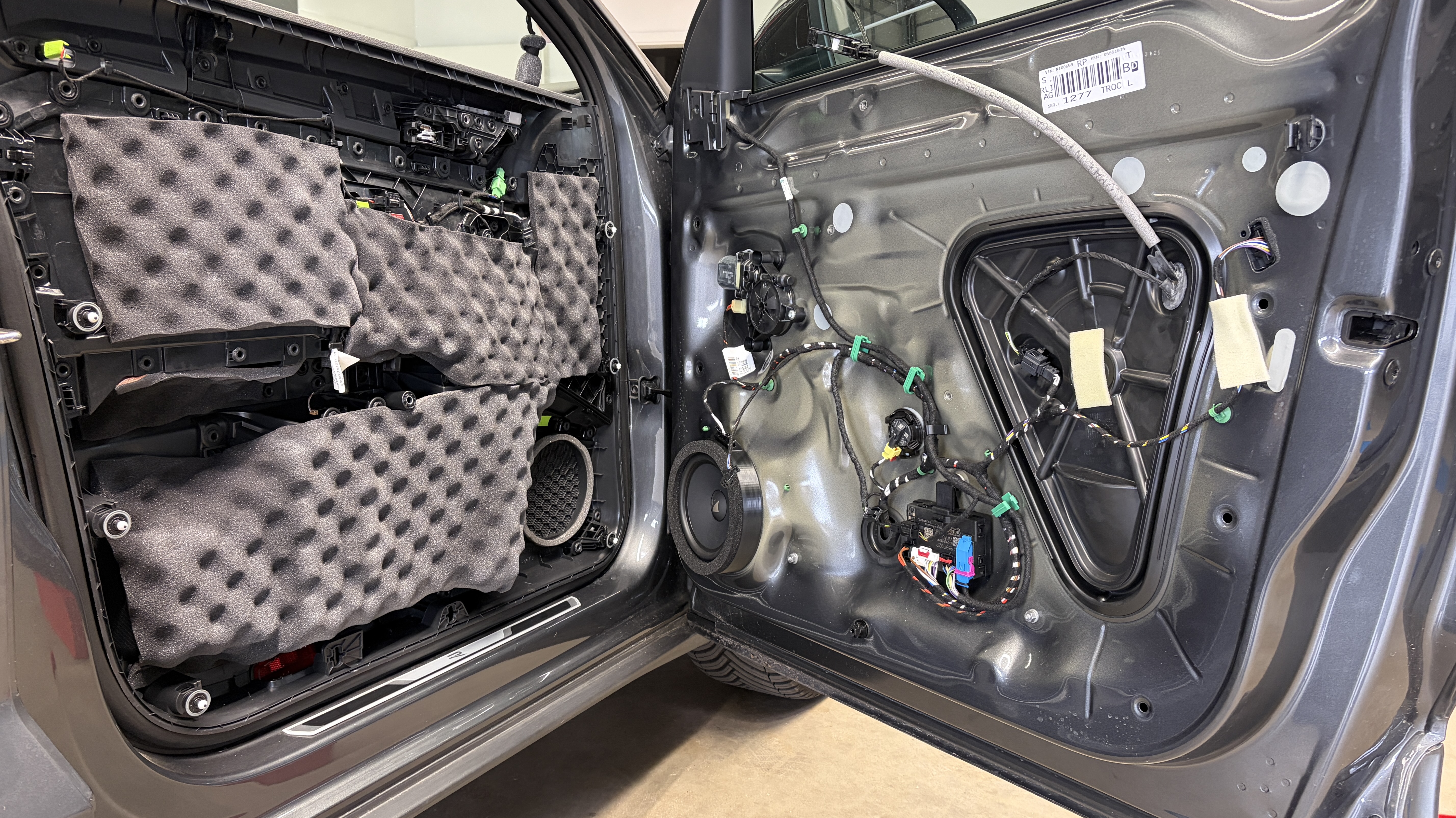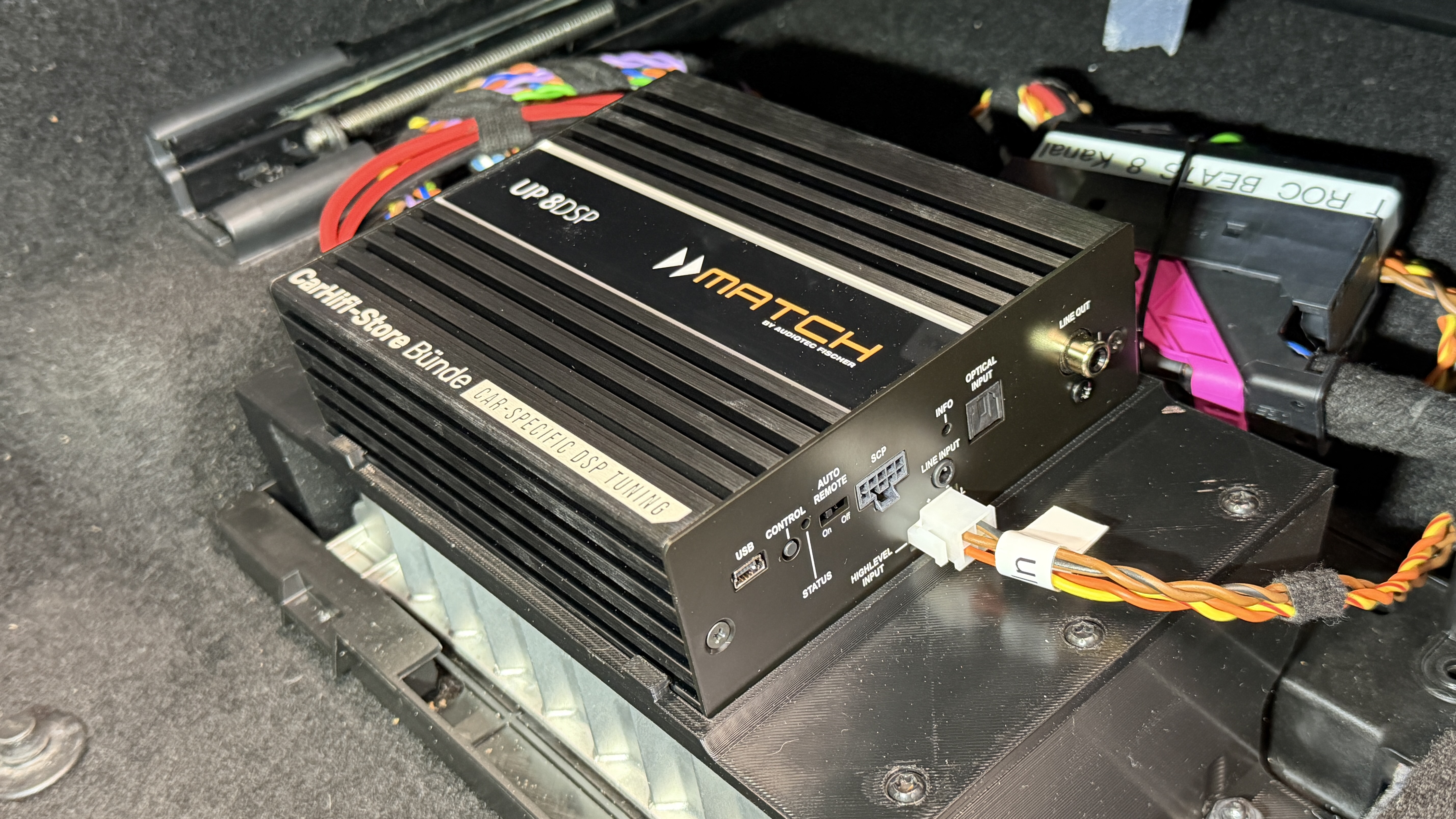 In den sorgfältig gedämmten Türen werden die Helix COMPOSE i3 Tieftöner auf unseren VW FlexMount165 Adaptern befestigt, hier wird der Stecker der ausgebauten Lautsprecher auch einfach wieder angesteckt. Die Hochtöner werden ebenfalls mit Adaptern in der A-Säule befestigt. Gleiches gilt für den Subwoofer, dieser kommt mit passender Befestigung zur einfachen Montage. Die Match UP 8DSP Endstufe kommt mit Halter (oder ohne, je nach Platz unterm Sitz) auf bzw. neben den original Beats Verstärker und wird dort mit unserem Plug&Play Kabelsatz adaptiert.