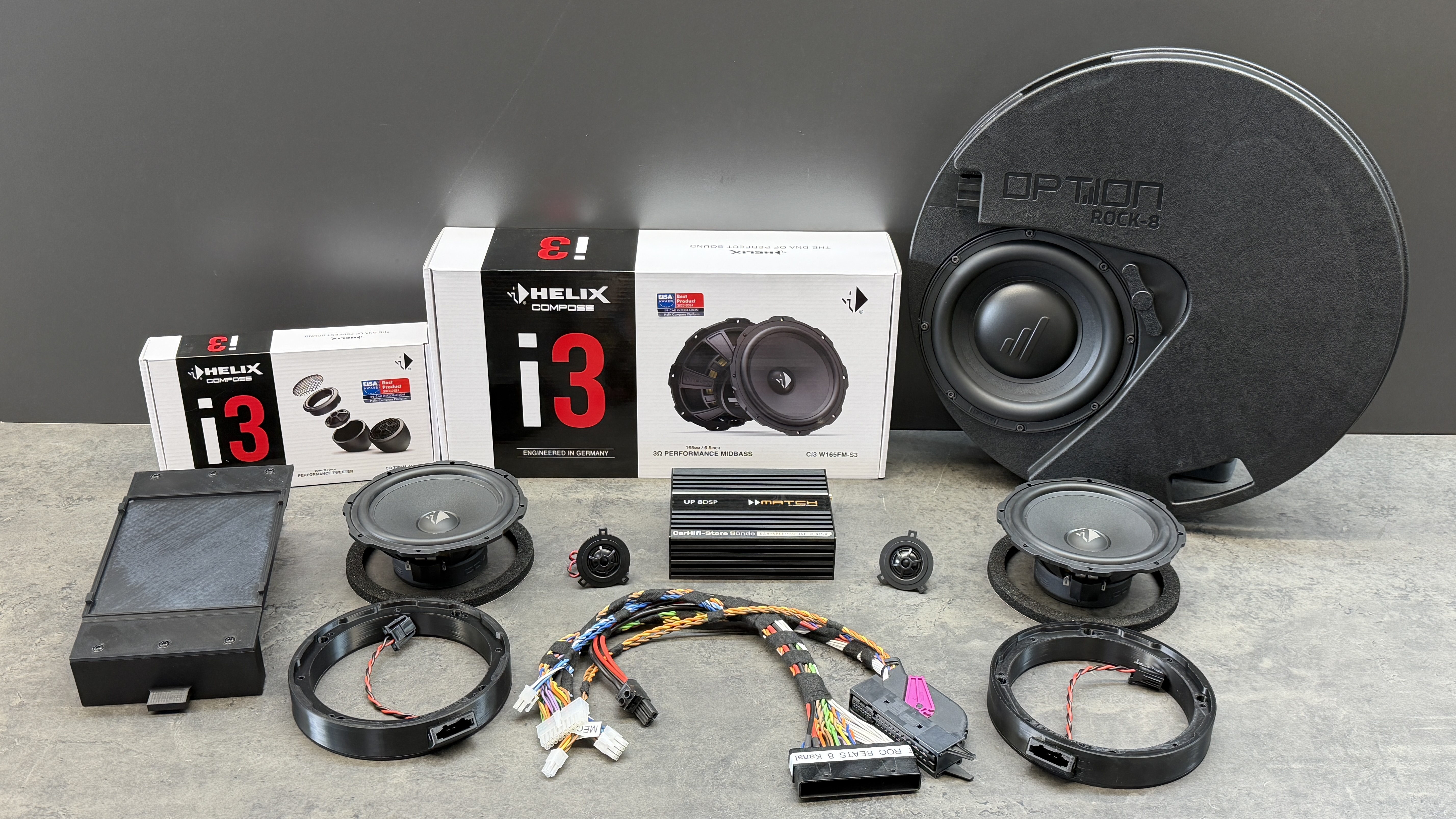 Upgrade des serienmäßigen Beats Soundsystems im T-Roc mit Helix COMPOSE i3 Lautsprechern inkl. Türdämmung, der 8-Kanal Beats Endstufe und dem Option Rock 8D2 Subwoofer als Ersatz für den Werkswoofer. Dieses Set ist eine sehr potente Klangsteigerung und verbessert den Sound deutlich.