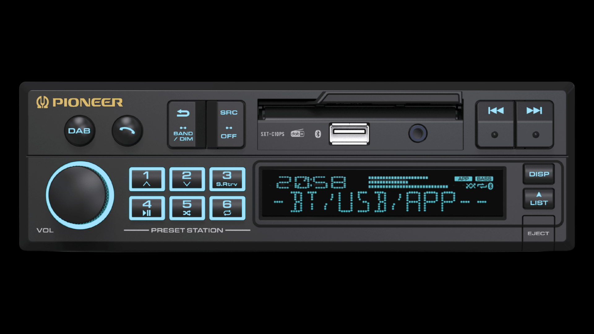 Das SXT-C10PS bietet DAB+ Digitalradio, Bluetooth (Streaming & Freisprechen) sowie USB und AUX an der Front unter der Klappe. Zusätzlich ist es mit der Pioneer Smart Sync App kompatibel.